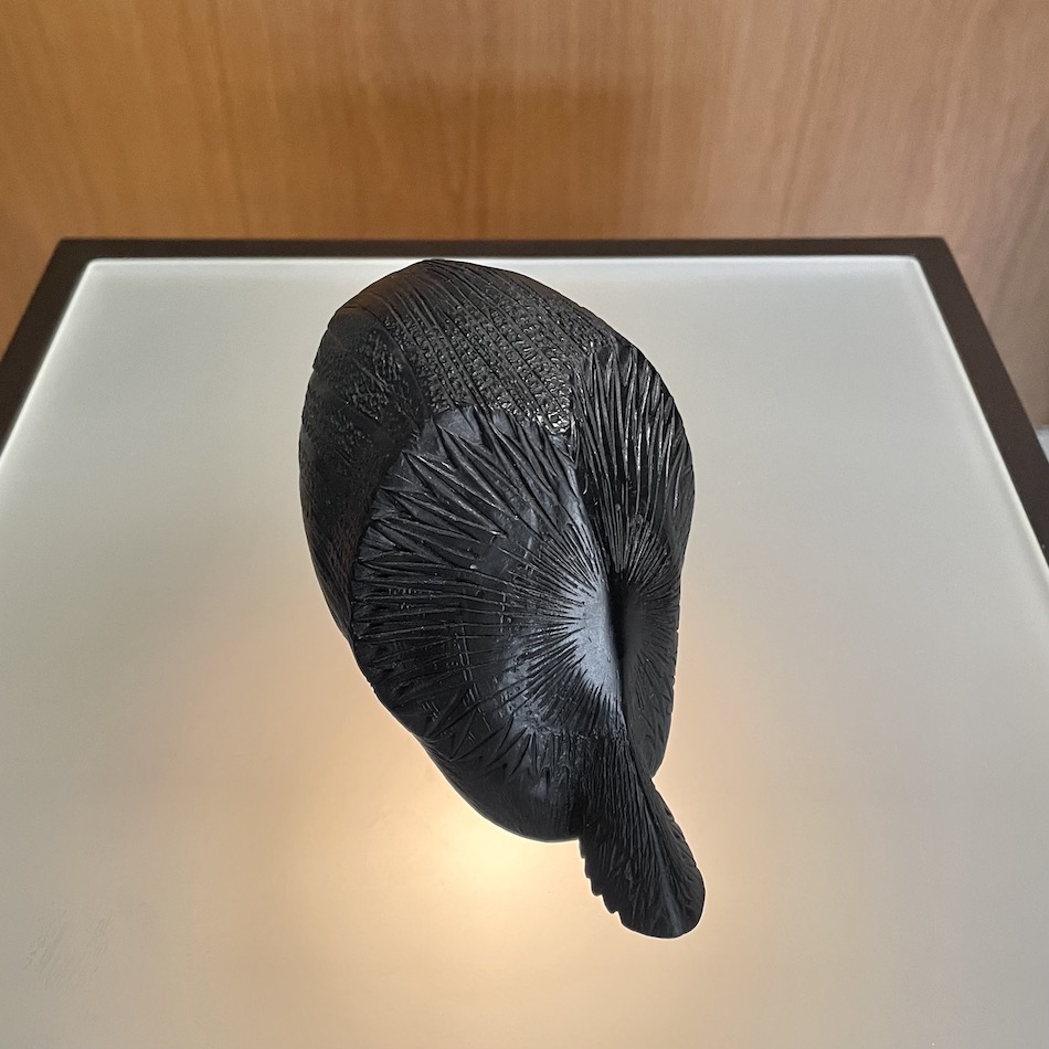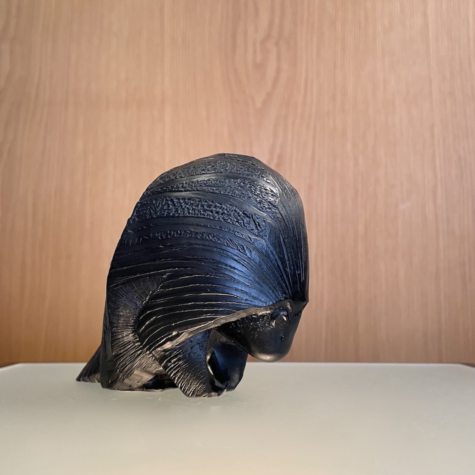 黒翡翠の艶のある顔部と石肌を残した胴体、原石のテクスチャーを巧みに活かした石彫フィギュア