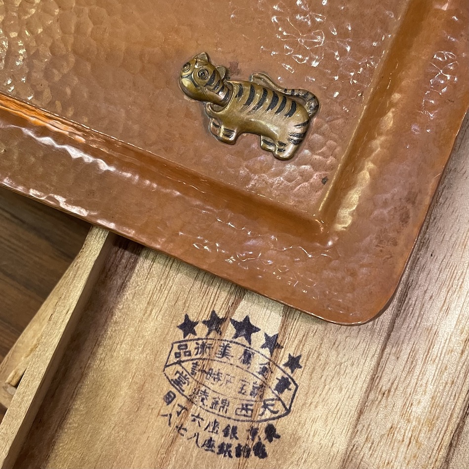 昭和初期 銀座 “大西錦綾堂” 純銅槌目銀銅虎飾り名刺盆