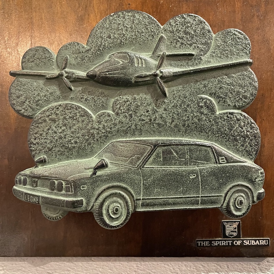 昭和48年に発売された”スバル レオーネ”のハードトップと同社双発プロペラ機”モデル700″をブロンズに刻んだレターラック。