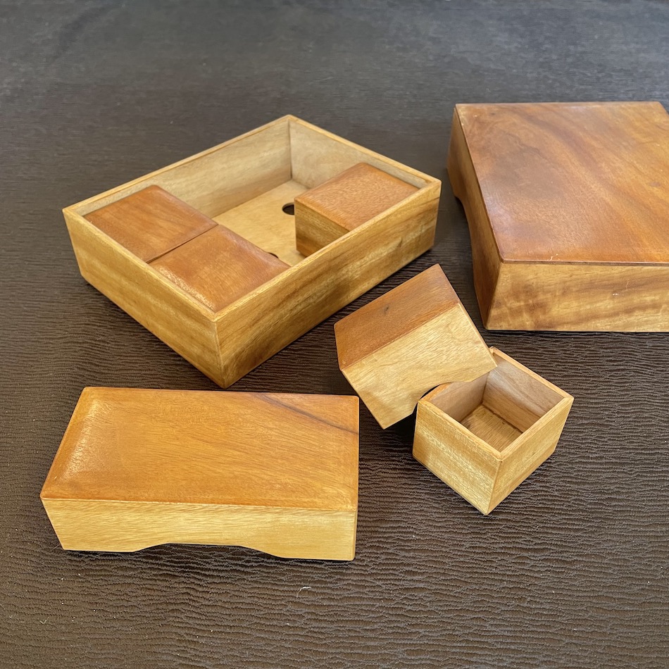 13.5×17.5cmほどのボックスの中にさらに小さなボックス計5個が綺麗に入れ子状に収まるウッドボックス。