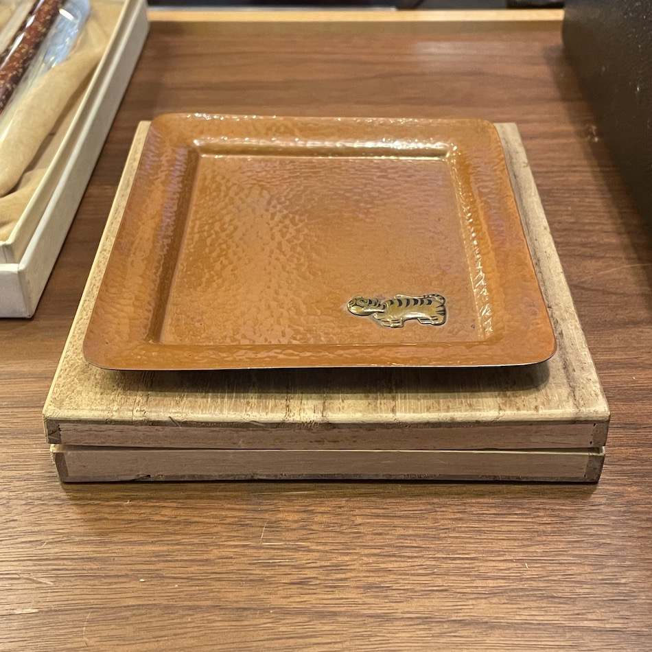 昭和初期 銀座 “大西錦綾堂” 純銅槌目銀銅虎飾り名刺盆