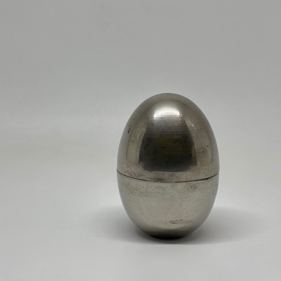 卵の中に3個のショットグラスが入れ子状に納まる国産のリカーグッズ。「1947 日本探鑛株式会社」の刻印あり。