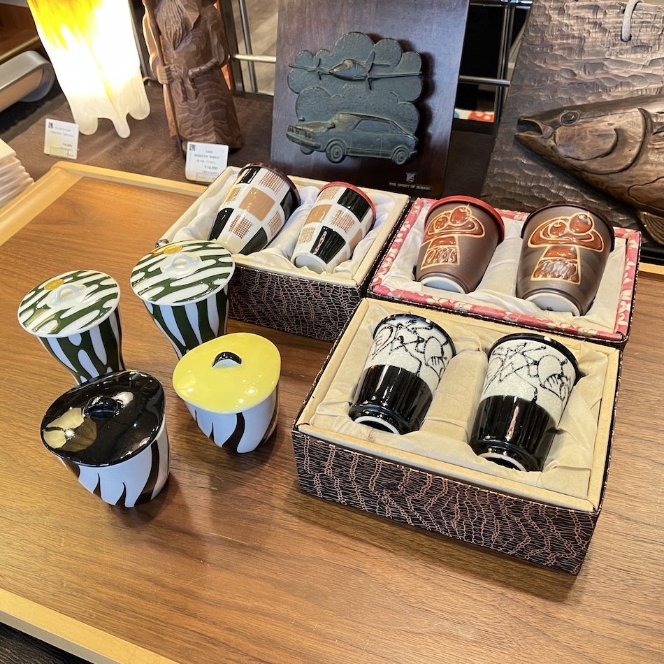 昭和中期、新婚旅行などで賑わった各地の温泉土産の定番であった夫婦湯呑み。レトロモダンなデザインが新鮮!