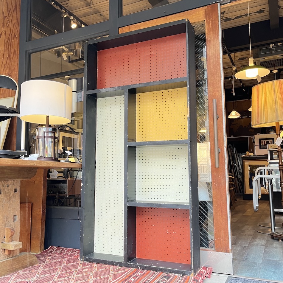 カラフルなカラーリングの有孔ボードを背板に使い、フック金具を使って様々な物を置いたり吊り下げたりできるシェルフ。