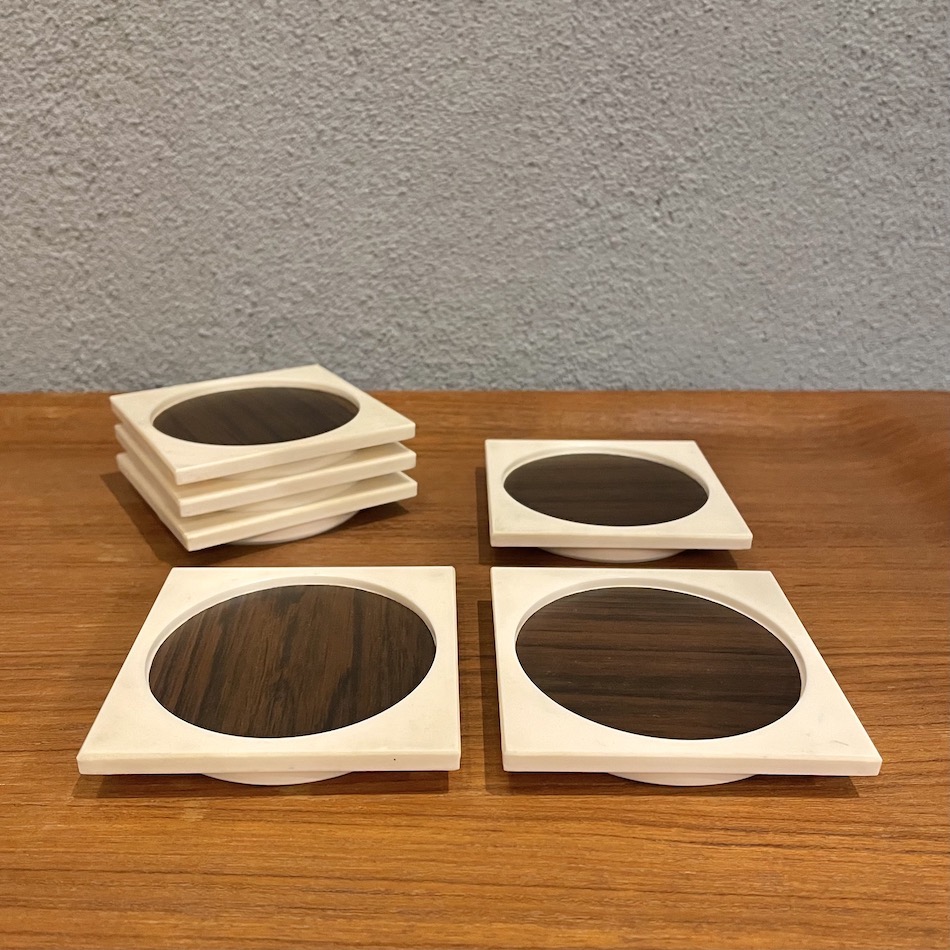 ホワイト樹脂のスクエアフォルム中央の丸い窪みにローズウッドプリントをあしらったモダンデザイン。綺麗に積み重ね可能。
