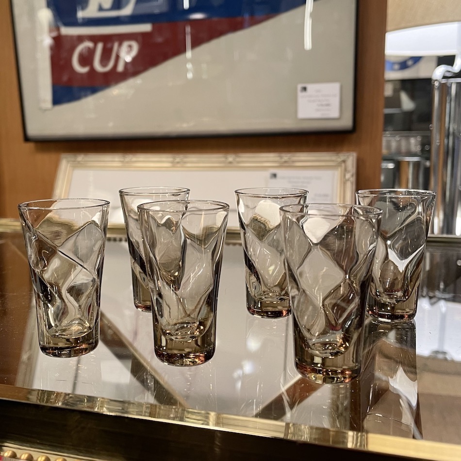 ひねり模様の入ったスモーキーカラーガラスのショットグラス。単品での販売です。
