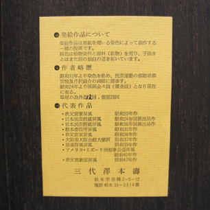 三代澤氏は芹沢銈介らと出合い民芸に開眼。柳宗悦の仕事に携わり、型絵染めで雑誌『工藝』の表紙制作を担い、長野県松本市を拠点にその他数多くの民芸運動の振興に注力。芹沢銈介と並び、日本民芸を代表する型絵染作家として生涯にわたって創作活動を続けました。<br/>
