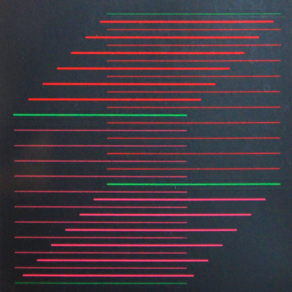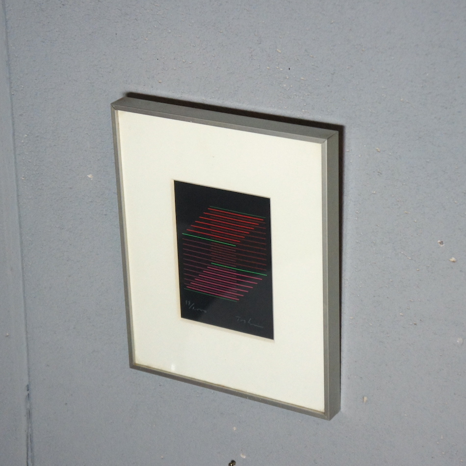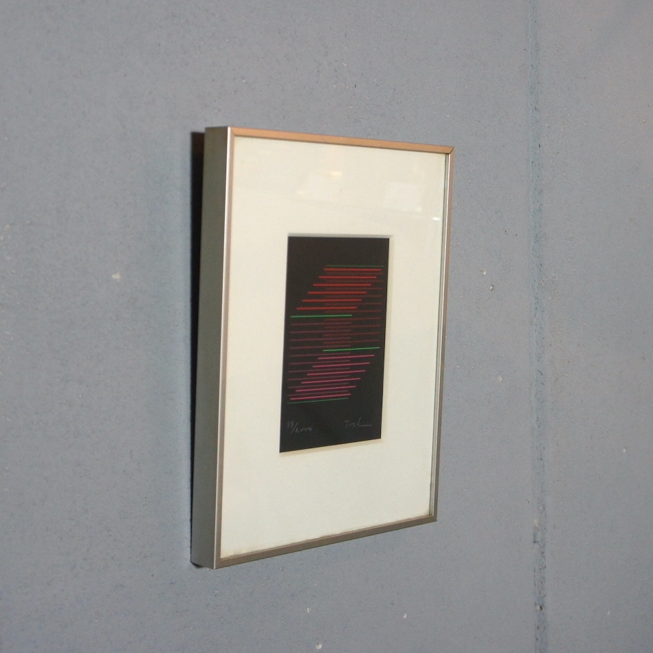 氏を語る上で欠かすことが出来ない”スクエア”のエレメントを2色の「線」の集積で再構築。規則的でリズミカルな線が面を形作り、視覚を平面から立体へと錯覚させるヴィジュアル・アートシリーズの1点です。