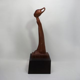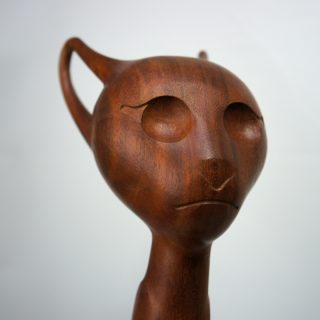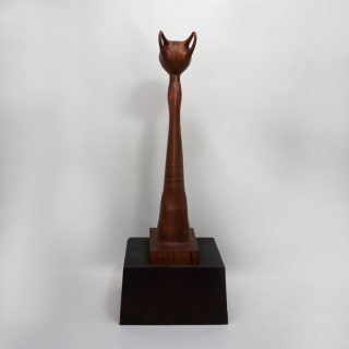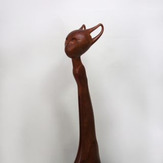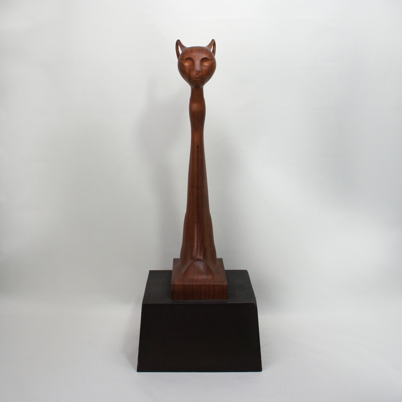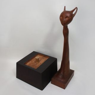 古風な手法による具象彫刻とは異なる日本的な宗教観を交えた様な神秘的造形。一見、犬とは思えぬような表情やフォルムですが、高い技術で彫刻され、対峙する事で見る物に不思議な安らかさを感じさせてくれる趣のある作品です。