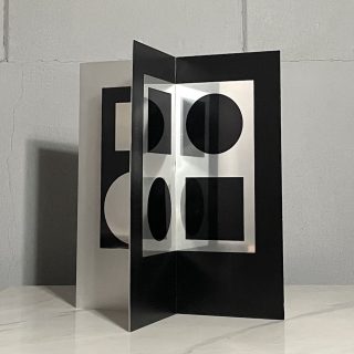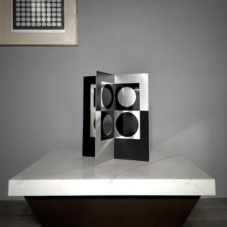 光沢のあるアルミのマテリアルとブラックのシンプルなカラー構成が光学的なイメージをいっそう強調し、写し鏡のように90°に向かい合いながらも微妙に異なるパターンが見る方向により様々なイメージを創造する”ヴァザルリ”ならではの表現かつ数少ない立体作品です。
