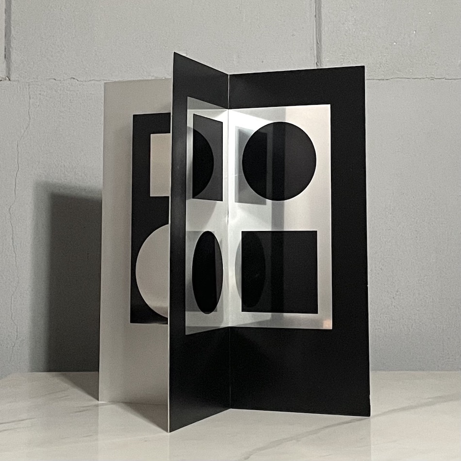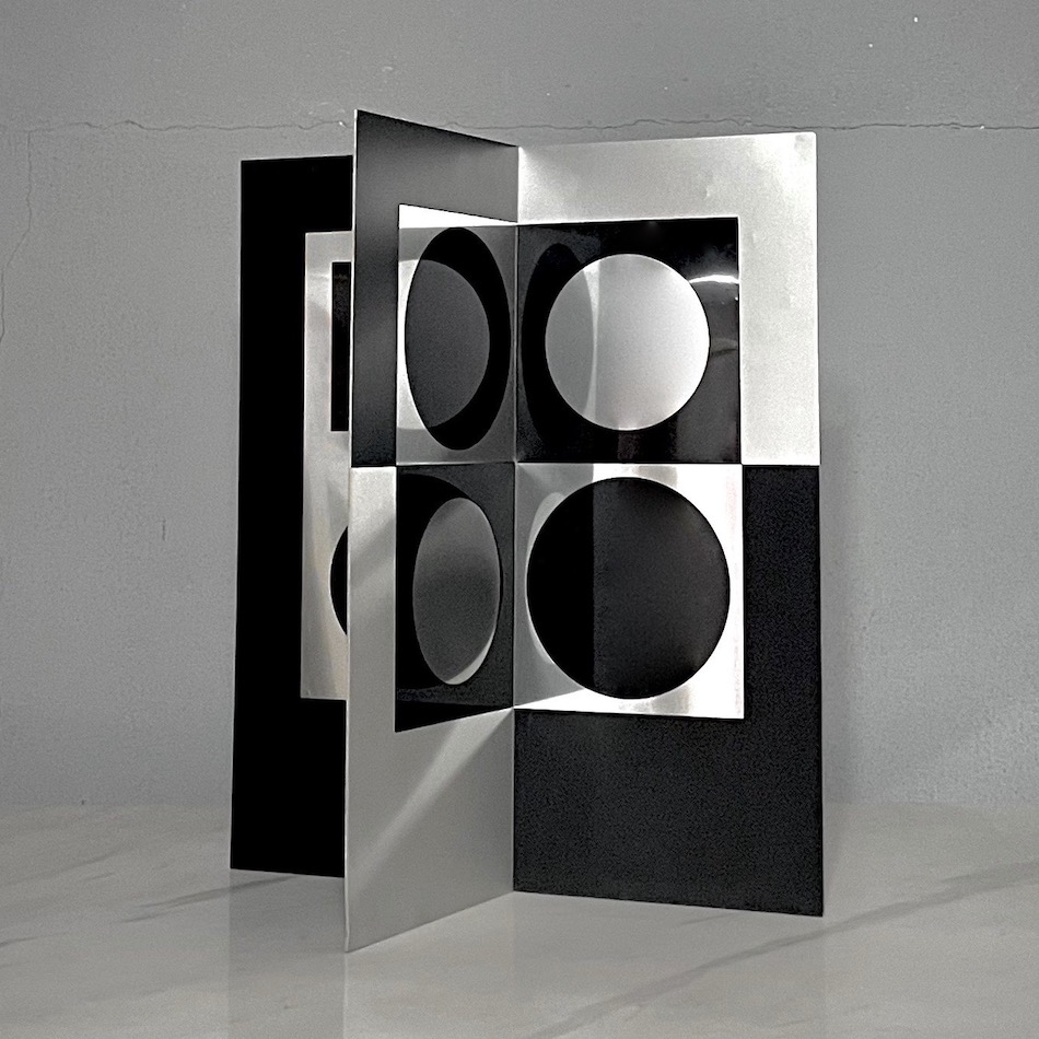 2枚のアルミパネルを中央で交差ジョイントした8面の立体に黒とメタル(アルミ地)のサークル+スクエアの幾何学パターンをスクリーンプリント。2色2形の組み合わせで8面それぞれ違うグラフィックを展開する3次元のオプチカルアートスカルプチャー。