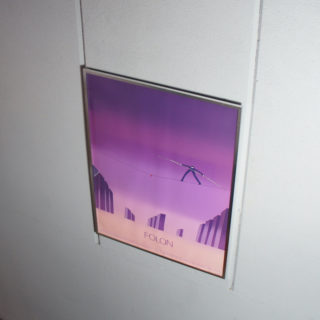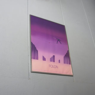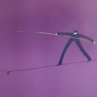 あの、ニューヨーク世界貿易センタービルの間を綱渡りする冒険家 “フィリップ・プチ / Philippe Petit ” を描いたとされる男性と中央の小さなハート。紫のグラデーションは漂う「緊張感」や「不安感」、赤いハートは挑戦者の「勇気」や「命」といったメタファーなのかも知れません。