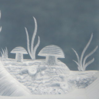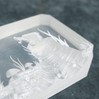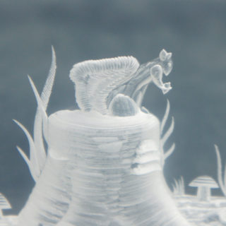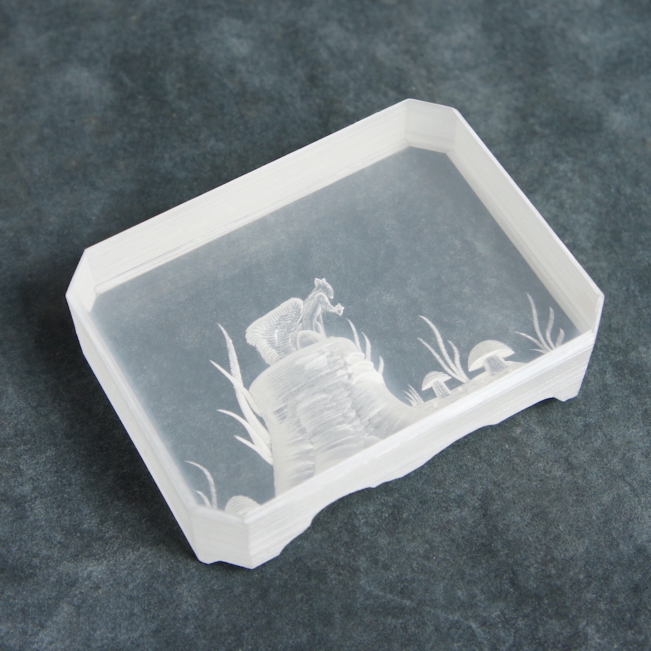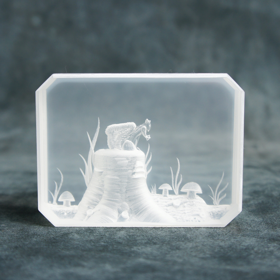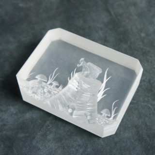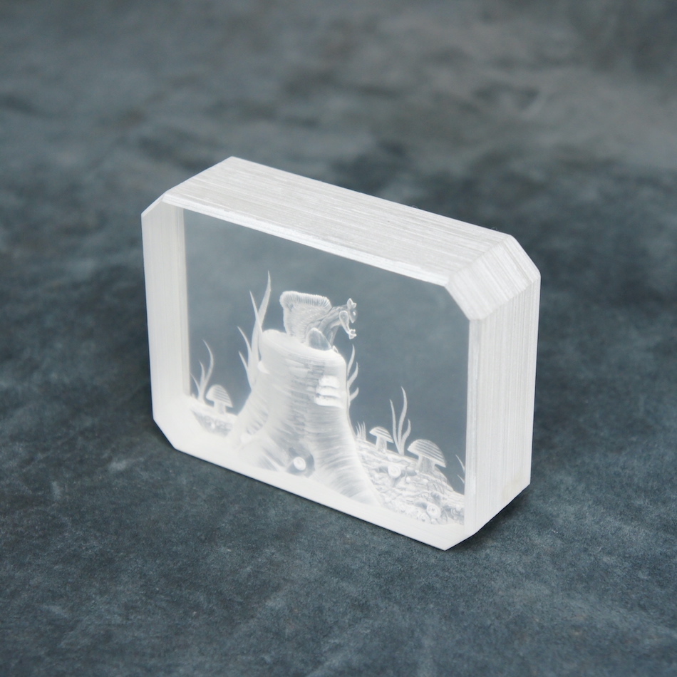 3cm厚のルーサイトブロックを緻密なエッチングで高低をつけて削り、3次元の立体風景を創り出す独自の技法によって幻想的な森の風景をキューブの中に浮かび上がらせています。<br>