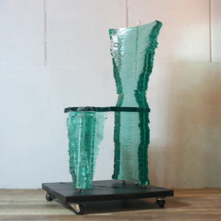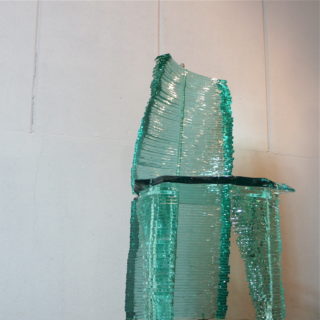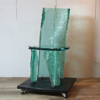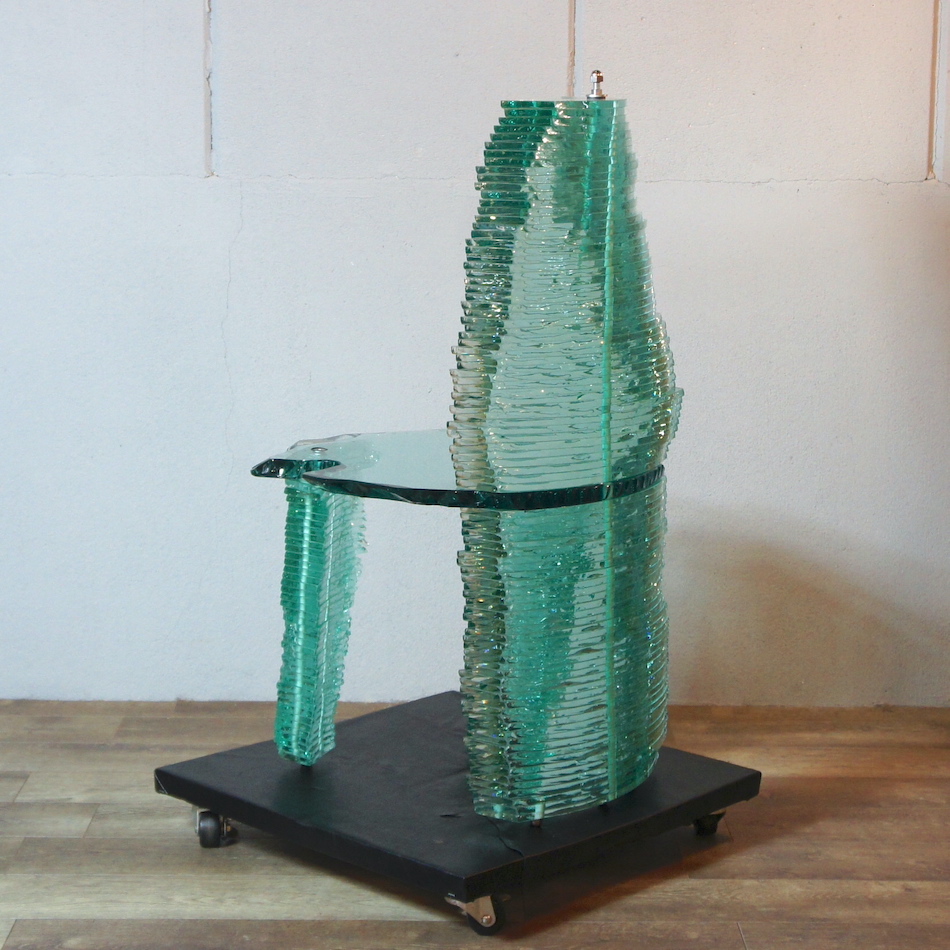 座面、脚、背もたれに至るまで全てのエレメントを不規則に造形カットされたガラスプレートを積み重ねて造形。その危うく繊細な姿は、見る者に座るための椅子という概念から解き放つような不思議な感覚を与え、異次元に存在する美しい物体として認識させる妖しい魅力を放っています。