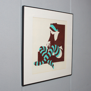入荷の作品は、太いボーダー柄のニーハイのソックスとヘアバンド、セピアの背景に鮮やかなミントグリーンを配し、2色のみで女性の柔らかなボディーラインやリラックスした雰囲気までも印象的に表現した技巧にも優れた作品です。