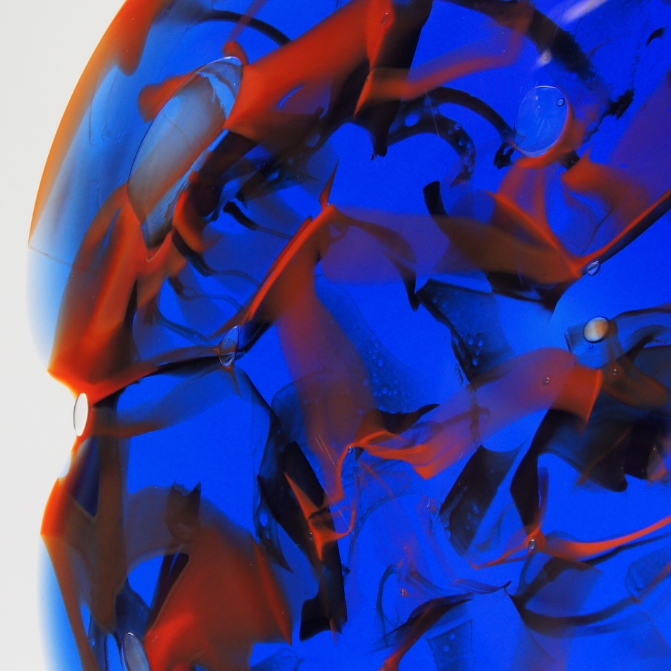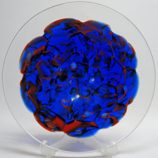 約40cmの分厚く大きなプレートの中央にブルーとレッドの模様がレイヤー状に散りばめられたダイナミックで美しいアートクリスタル。