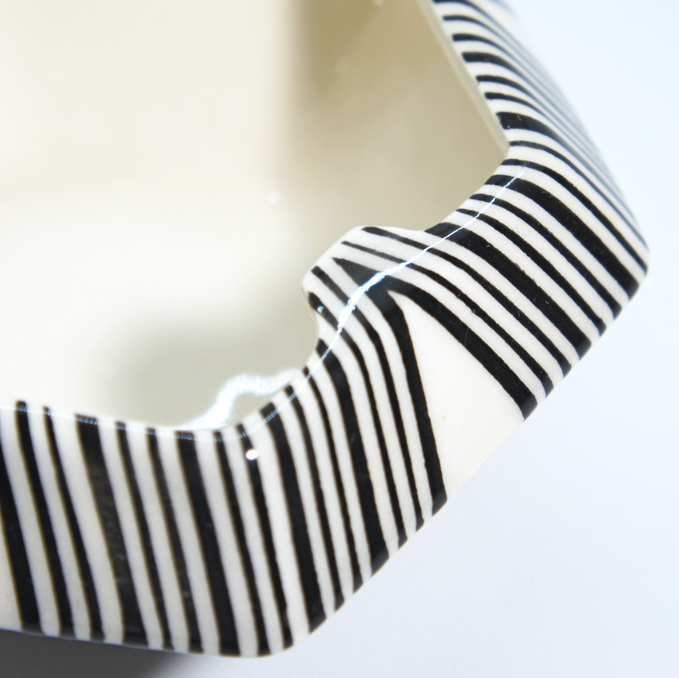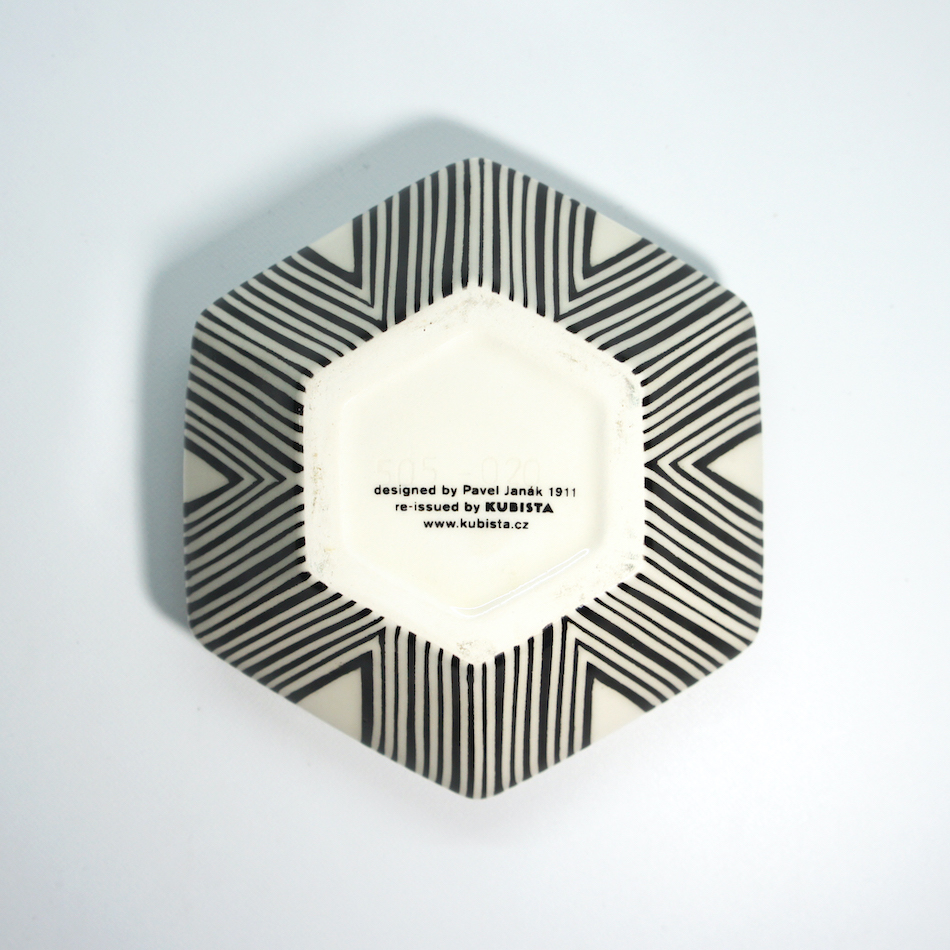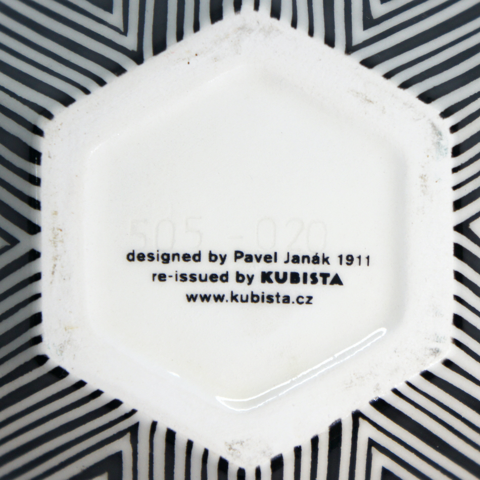 六角錐を上下交互に積み重ねたようなフォルムに細密なストライプペイントを施したチェコ・キュビスムを象徴するダイナミックなデザイン。プラハの若き建築家達が1910年代に「チェコ・キュビスム」の名のもとに建築や工芸のフォーマットで具現化した三次元表現は世界でも他に類を見ない唯一の試み。<br>