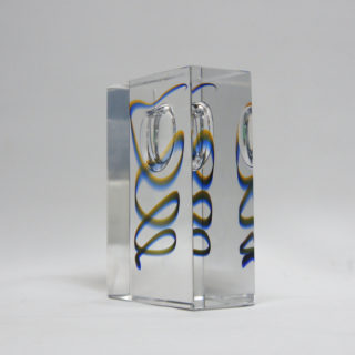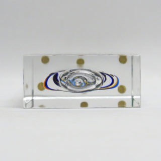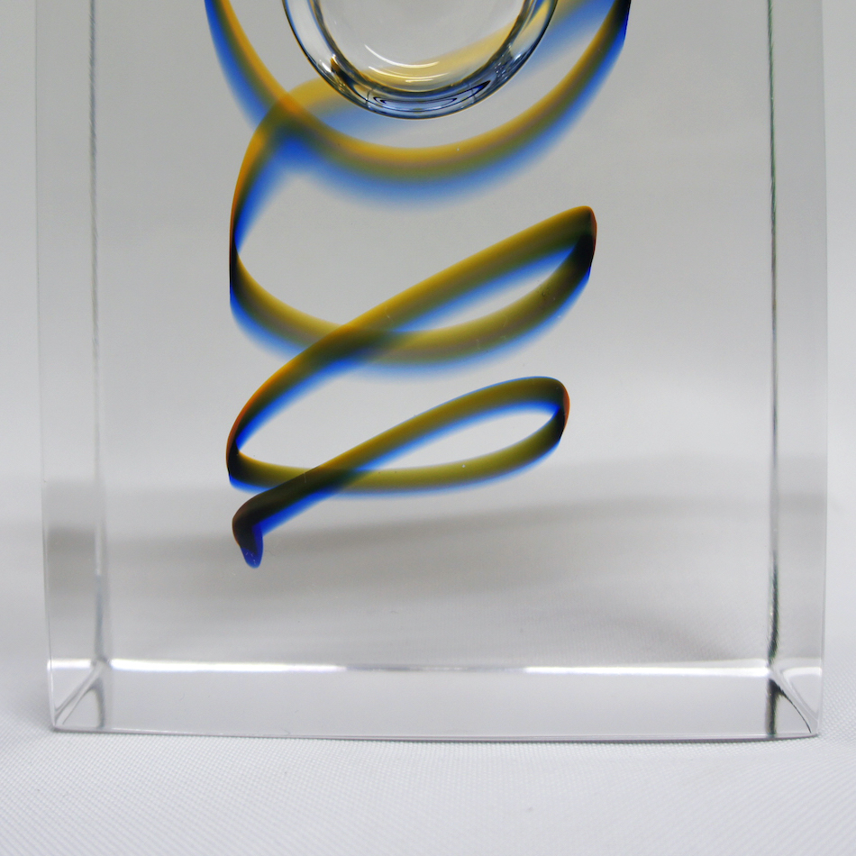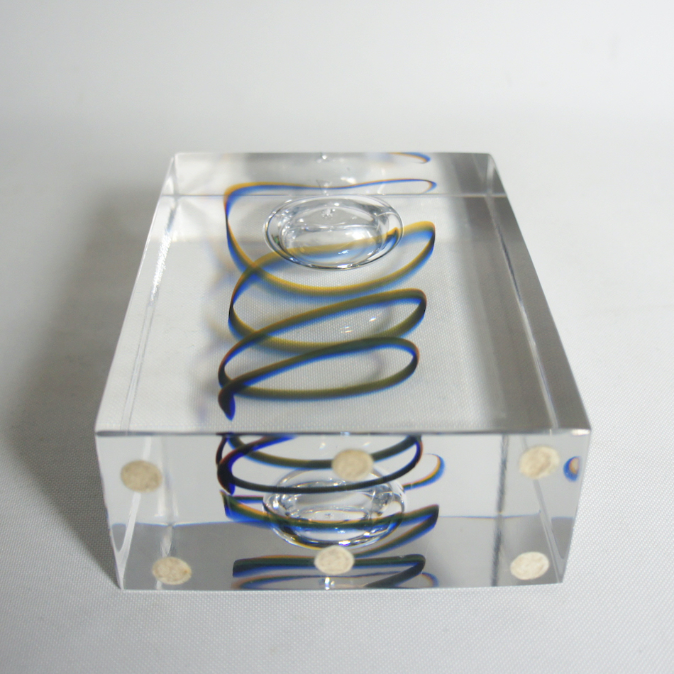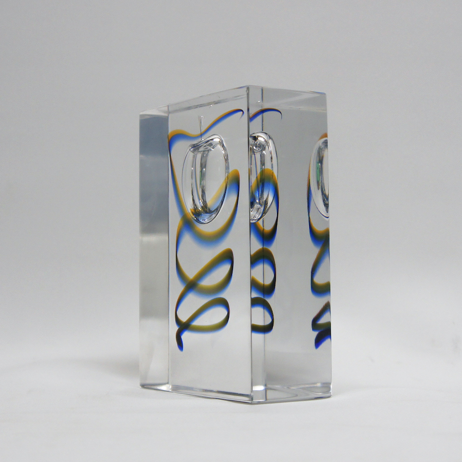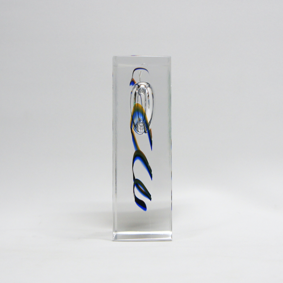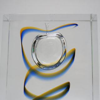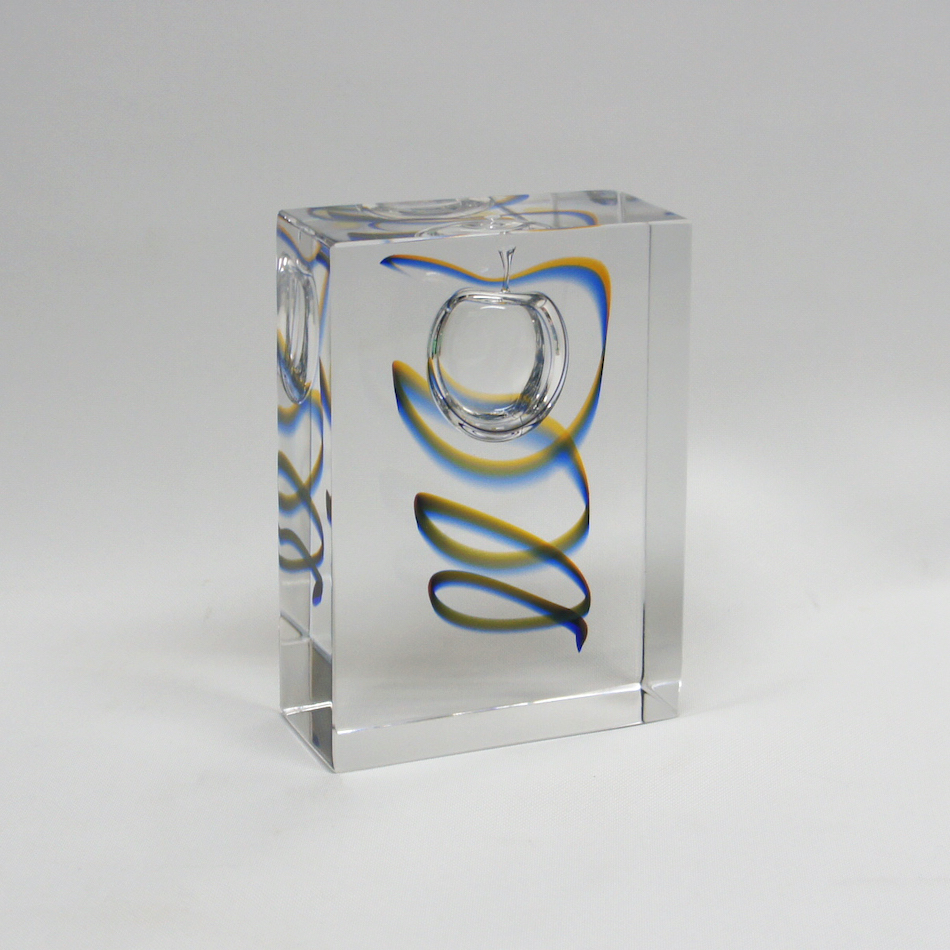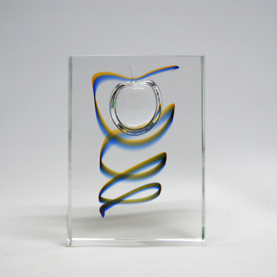 50㎜の肉厚な直方体の中にリンゴを閉じ込めたガラスの抽象オブジェ。