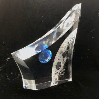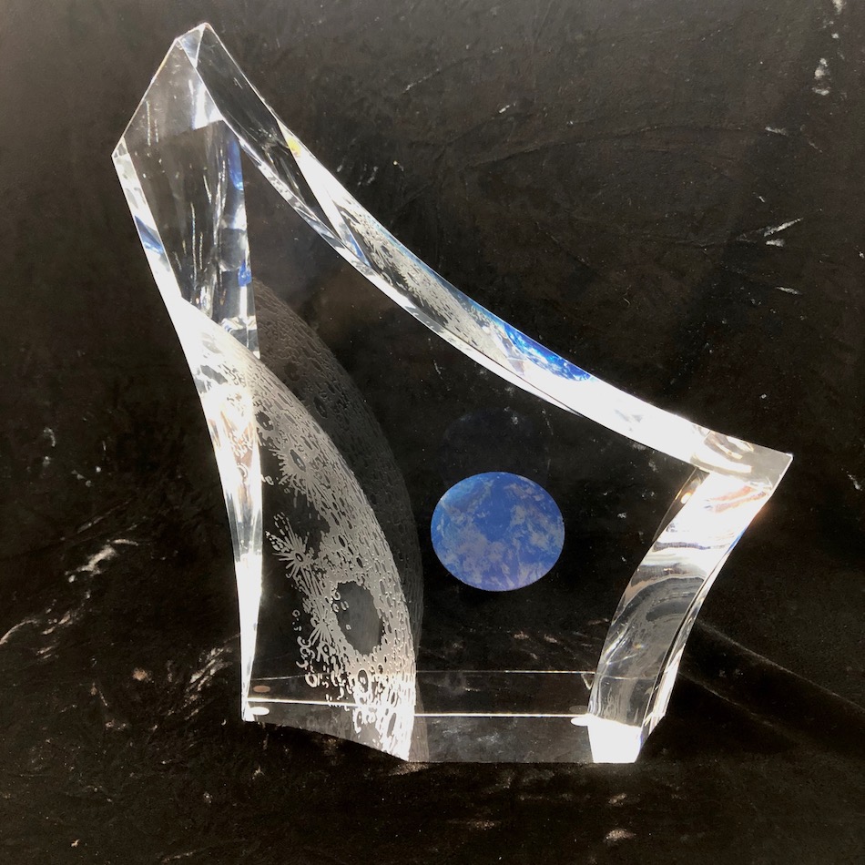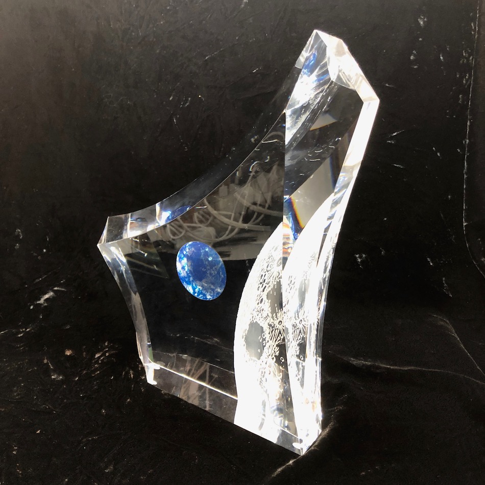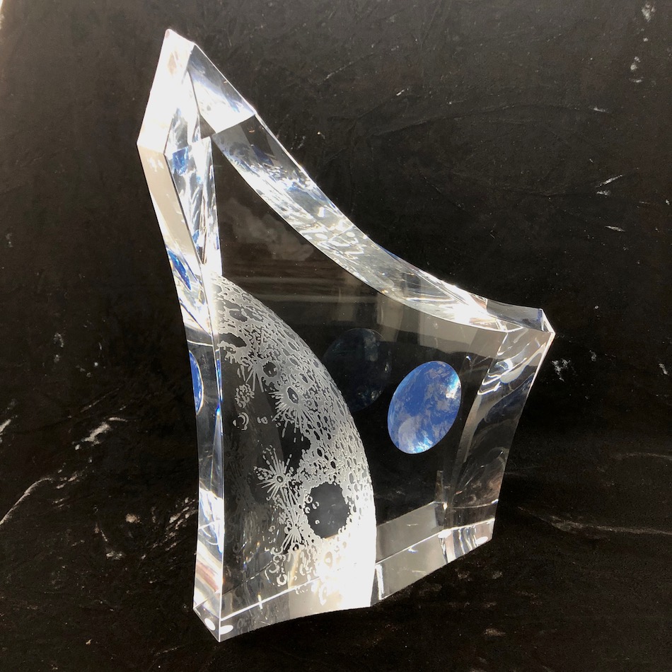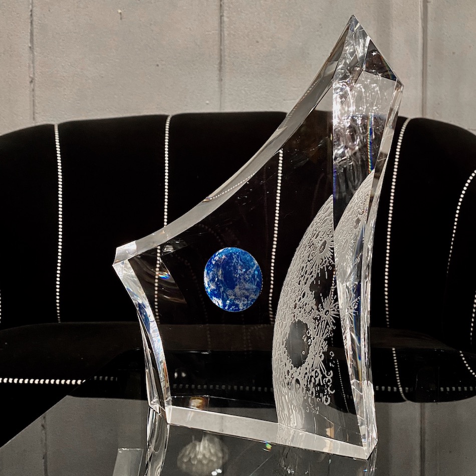 全高350mmのシャープなフォルム、厚さ60mmの分厚いクリスタルの塊にエングレービングで月面を描き、中央に青く輝く地球を閉じ込めた3Dビューの立体アート表現。