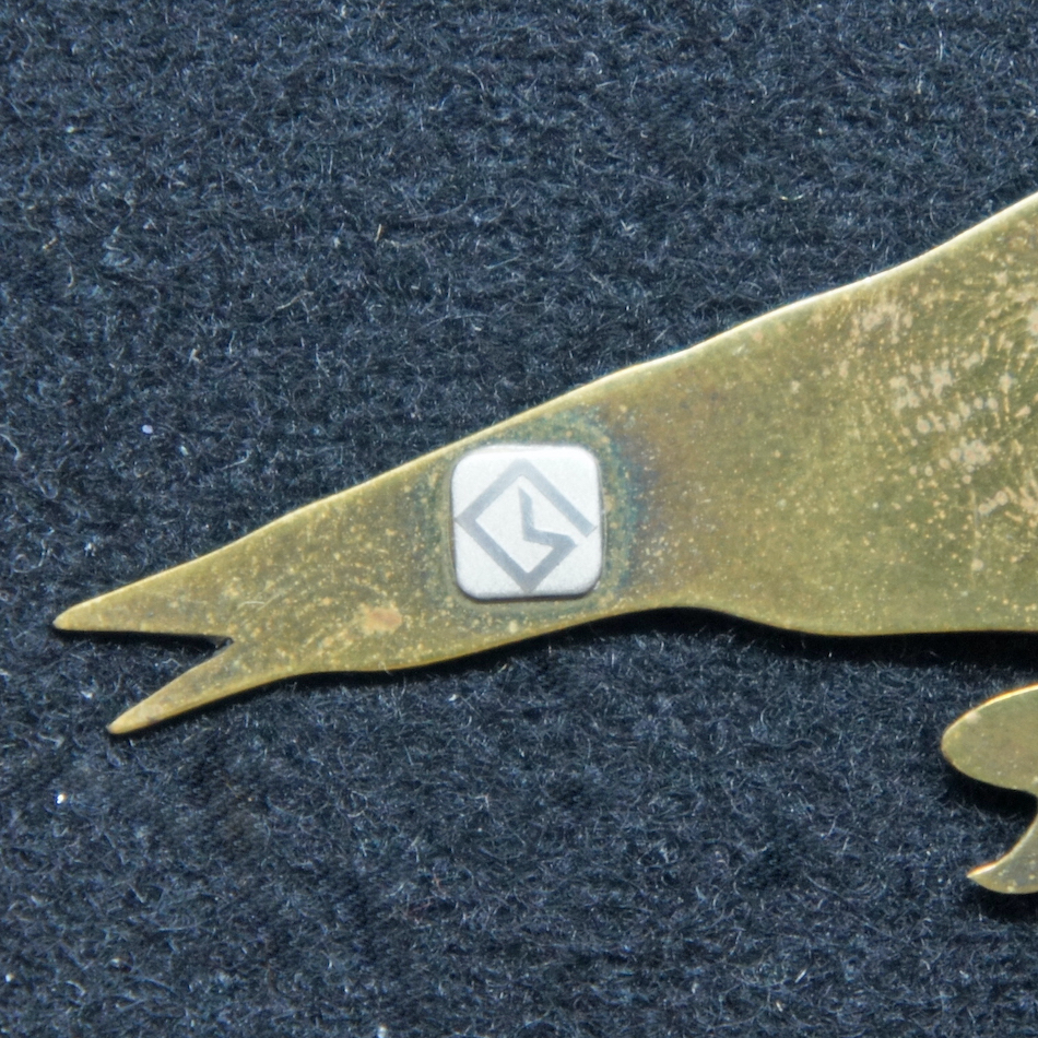 鳥と眼鏡の形に抜かれた真鍮のプレート。眼鏡にはガラスが填りリベットで固定されています。