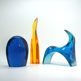 3種とも、透明なカラールーサイト(アクリル樹脂)のミニマルな抽象的造形ですが、それぞれの特徴を的確に捉えてとても魅力的。