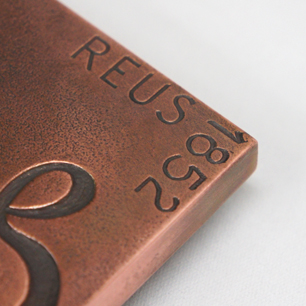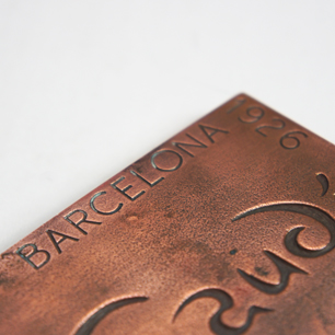 表側は度々モチーフとして氏が描いてきた晩年のガウディの横顔。どこか達観したかのような充足感に満ちた表情を浮かべているように見えます。裏側にはgaudiの名と、生まれた故郷レウス、亡くなった都市バルセロナの名が刻印されています。