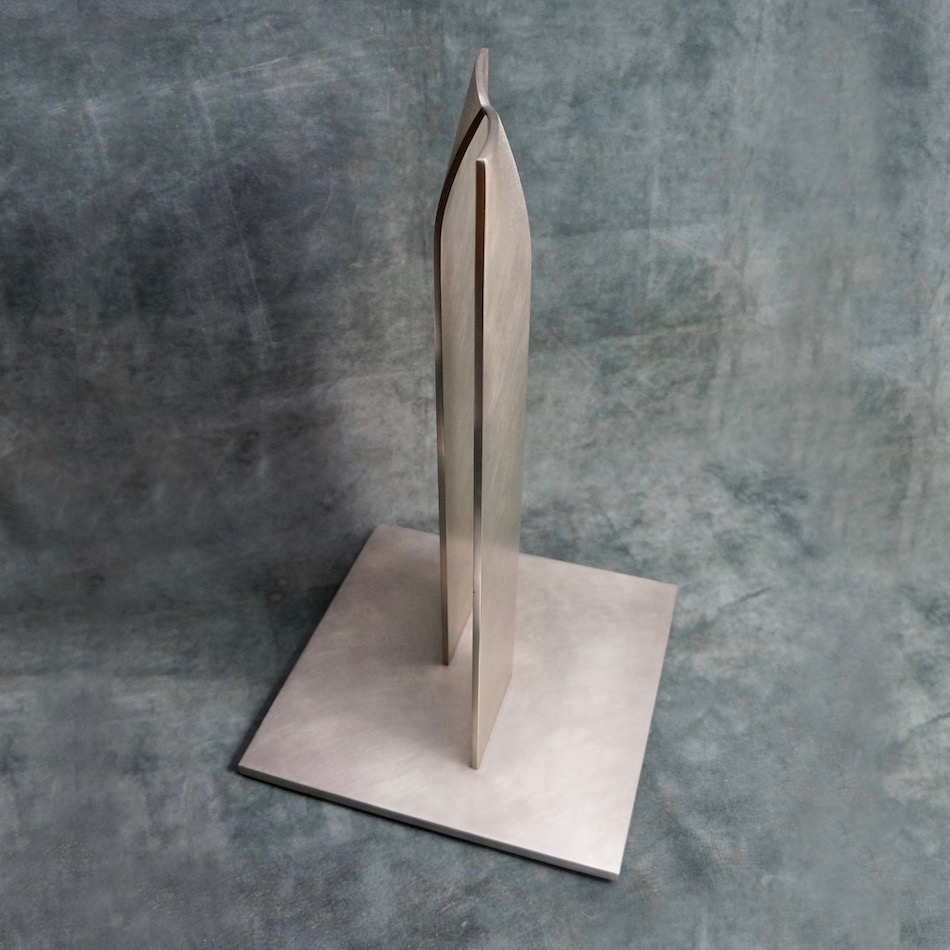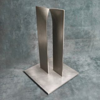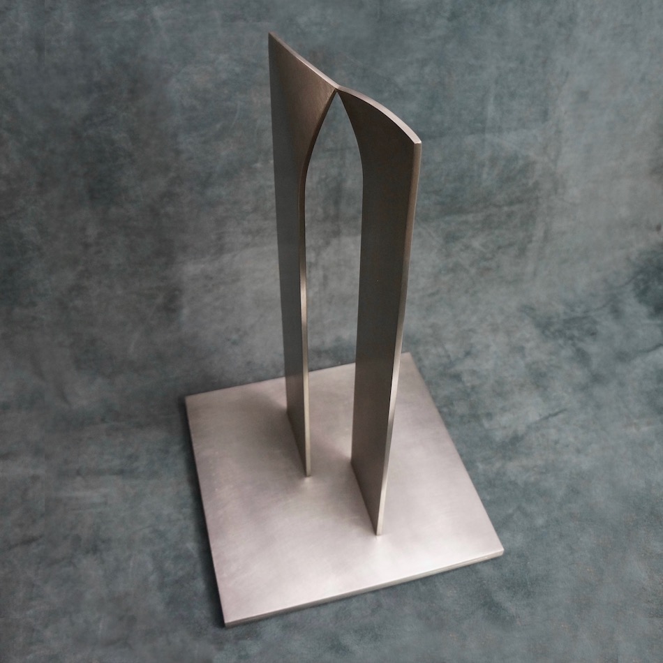 前後ずらして配置した2つの厚いステンレスプレート、その上部が引き寄せられる様に湾曲して接近し、各コーナーの1点で接する造形の金属彫刻です。