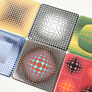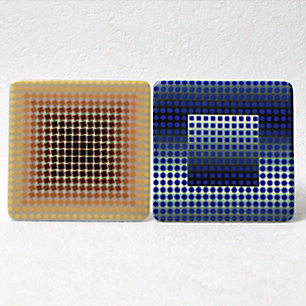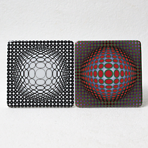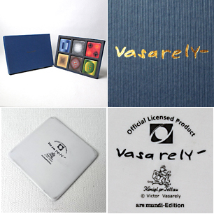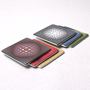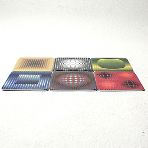 ドイツ・Königlich Tettau社のコースターセット。デコレーションデザインはVictor Vasarely(ヴィクトル・ヴァザルリ)。幾何学模様を用いたオプティカル・アートの先駆者として絵画、建築、立体アートなど多岐に渡り活動。革新的な色彩と描写は現代美術の作家達に強く影響を与えている。 こちらはヴァザルリの代表的アート作品6点をデコレートしたコースターセット。