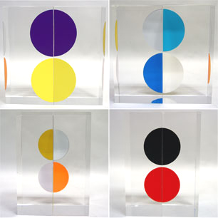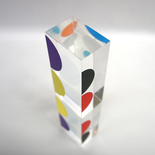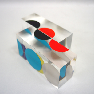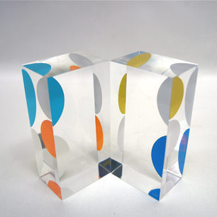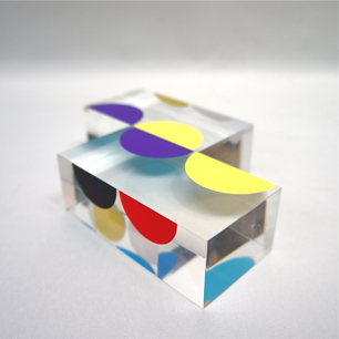 アクリルの立方体にプリントされているレンチキュラーの手法を用いた9色8対の半円の創り出すビジュアルが、配置や視線によって無限の視覚世界を構成する独自のアガモグラフィー立体作品。