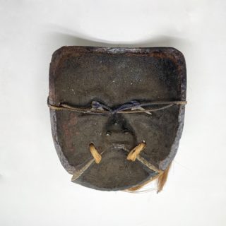 この面は狂言で天下泰平・国土安穏を祝して舞う[翁ノ舞]でかけられる「白式尉(はくしきじょう)」。翁の面は他の能面と異なり、能が成立する以前からめでたい神事のものとされ、縁起の良い飾りとしても重宝されてきました。