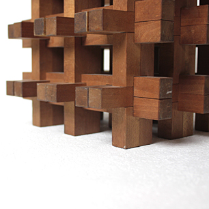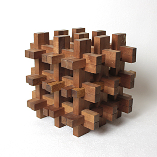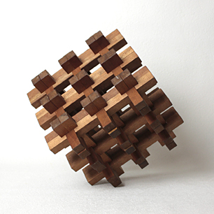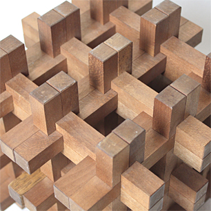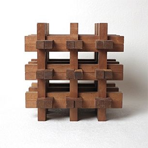 明治20年頃 、指物技術をマスターした山中常太郎によって創始された神奈川県・小田原市の山中組木工房。パッケージデザインに柳宗理氏も携わった事でも知られている。シリーズ中最大の大きさとなる立体パズルは合計54本のシウリ桜のパーツを組み合わせた幾何学的形態。清水の舞台を想起させる釘を一切使わない直線的な木組み構造の立体玩具はオブジェとしても楽しめる。