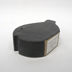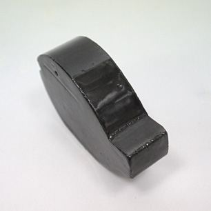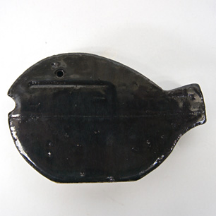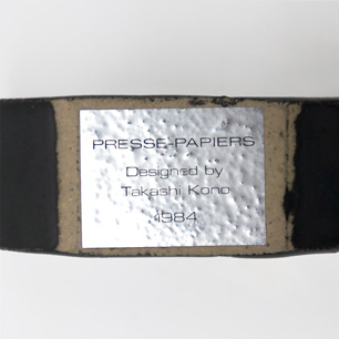 濃紺の釉薬で覆われたズッシリとしたボディー。その簡潔でユーモラスな造形は紛れもなく河野氏の”さかな”。底に貼られたラベルには”PRESSE-PAPIERS Designed by Takashi Kono 1984″と記されており、円熟した70歳後半、デザイン界では重鎮として権威性の高い仕事を手がける中でも、常に特別であり続けた愛すべきモチーフ”さかな”への思い入れの賜物。ビジネスとは壁を隔てて自身のライフワークとして創作した表現作品です。