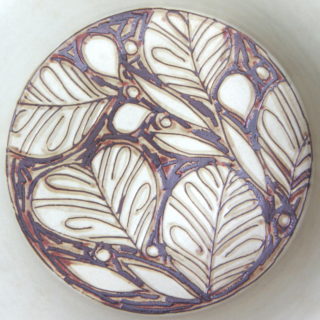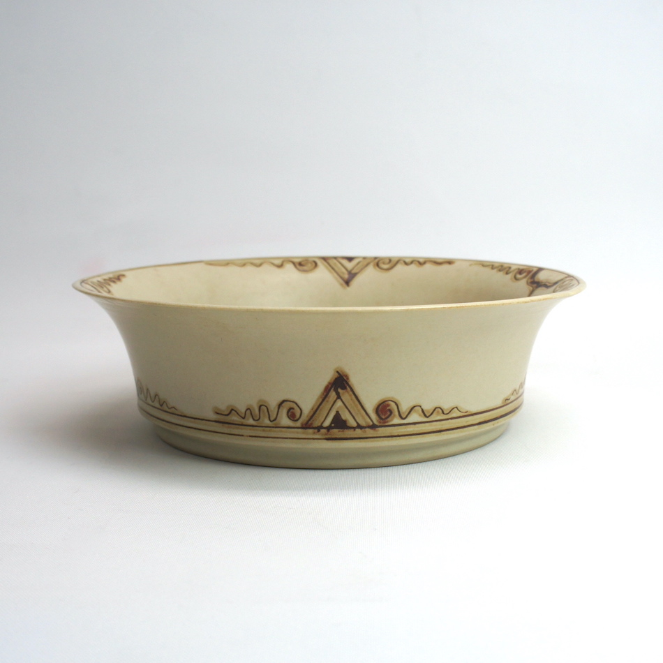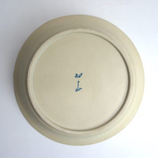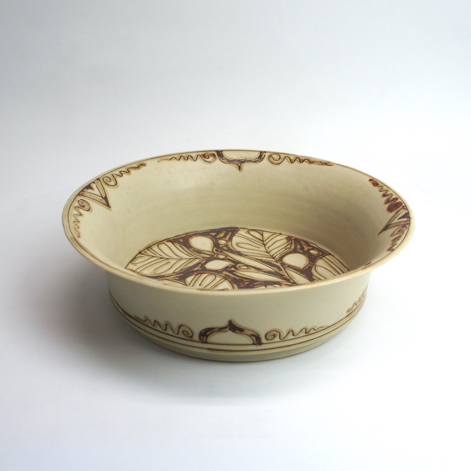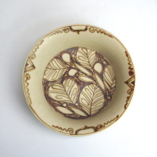 陰刻された見込の葉紋と縁、高台周りの飾り紋を鉄釉で色付けした、北欧のそれを思わせる大胆でおおらかな絵柄。<br>