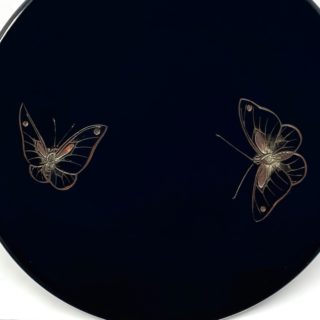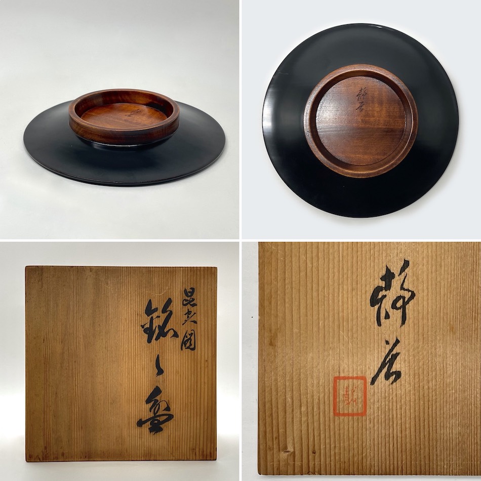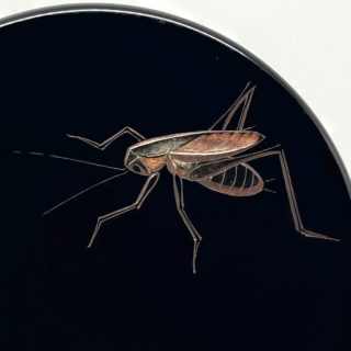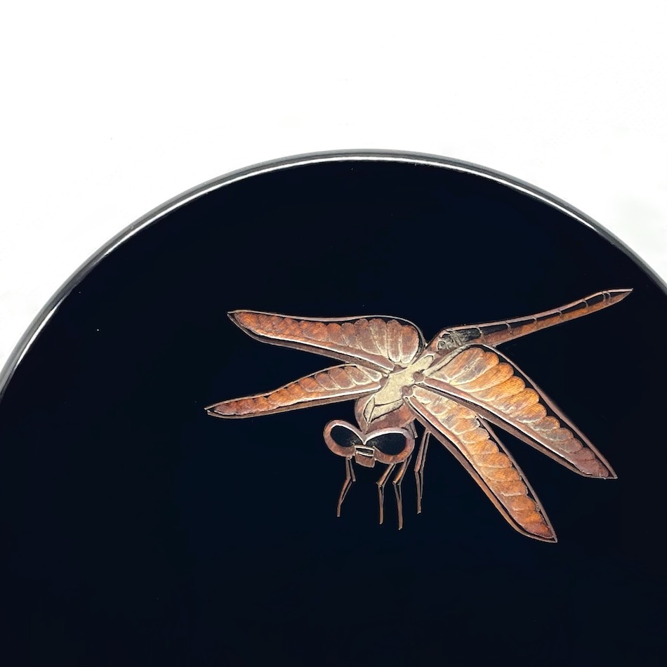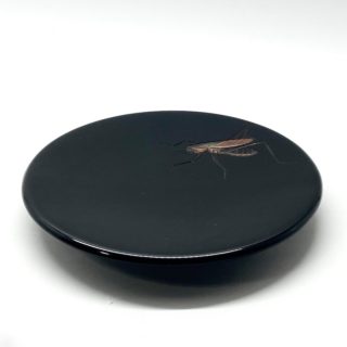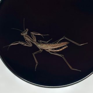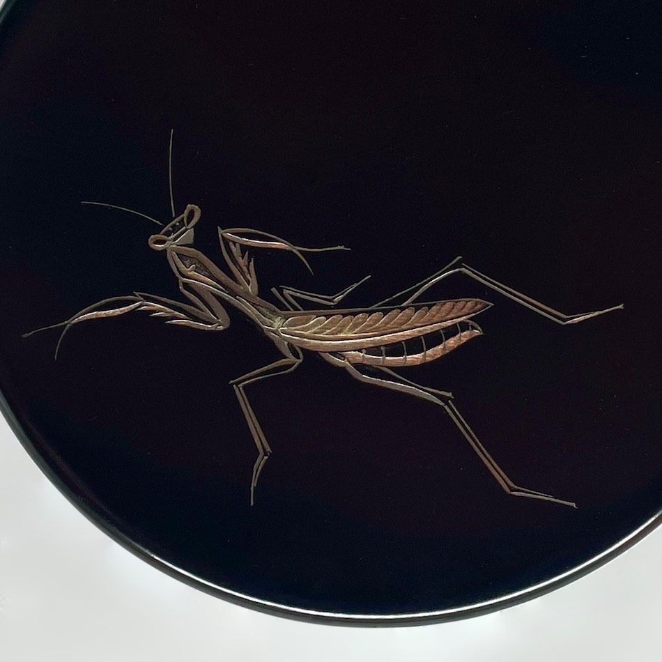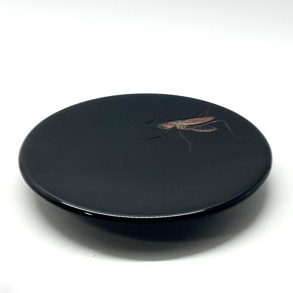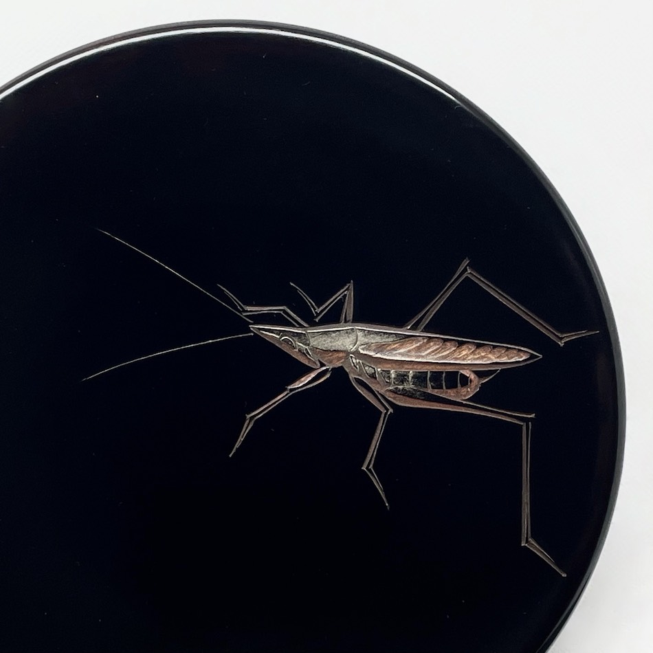 黒漆を用いた「堆黒」の余白を活かし、写実的な虫たちに動きと生命感を与える日本画的な構図。高台部分のみ拭き摺塗の杢目を残した粋な意匠です。