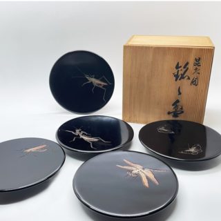 香川漆工芸 讃岐彫 “高橋静道” 作「昆虫図」銘々皿 五柄一組
