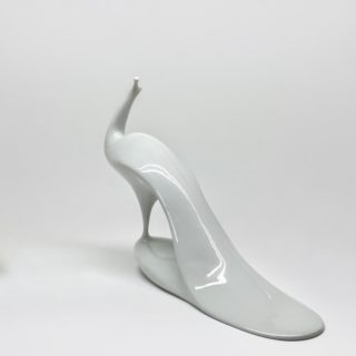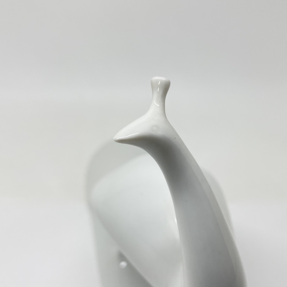 細く長い胴体にに極端に小さな頭部。ミニマルでシャープに表現された造形は以前に紹介したブラックの個体と同一ですが、滑らかな純白の白磁ボディに当たる光によって濃淡やハイライトを描き出し、造形美をよりいっそう際立たせます。