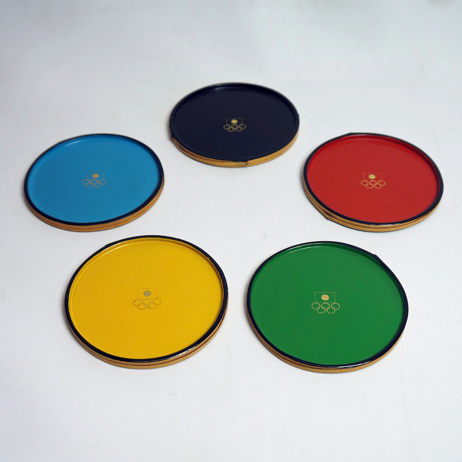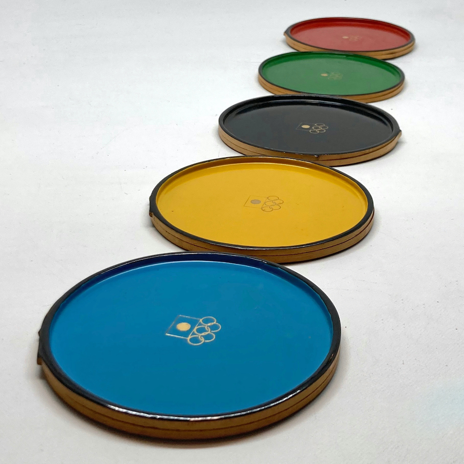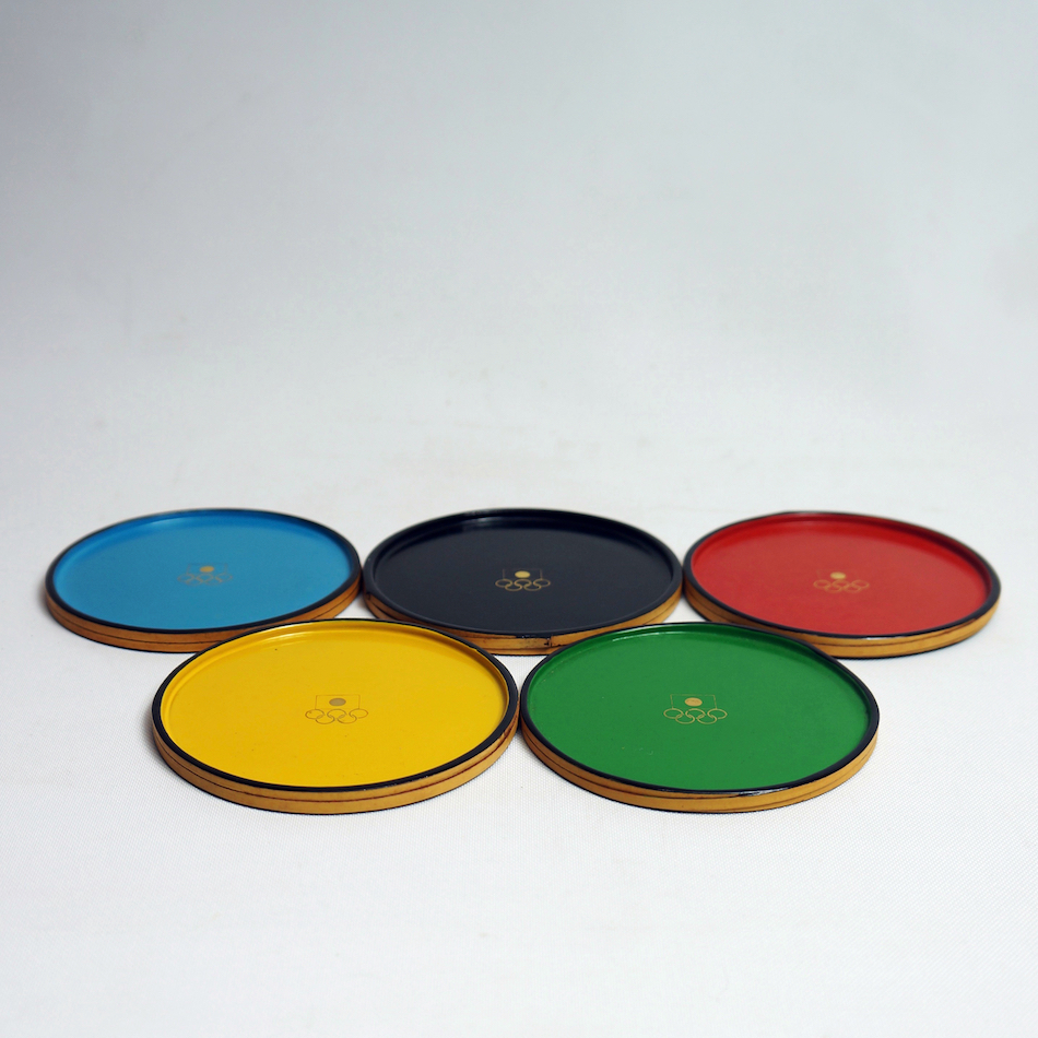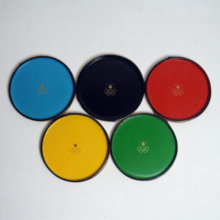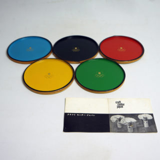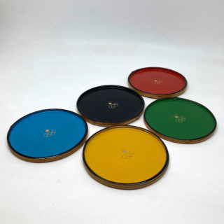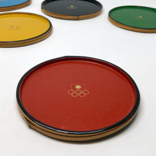 1964年のオリンピック東京大会開催に合わせて制作された五輪マーク入り竹工芸コースター。