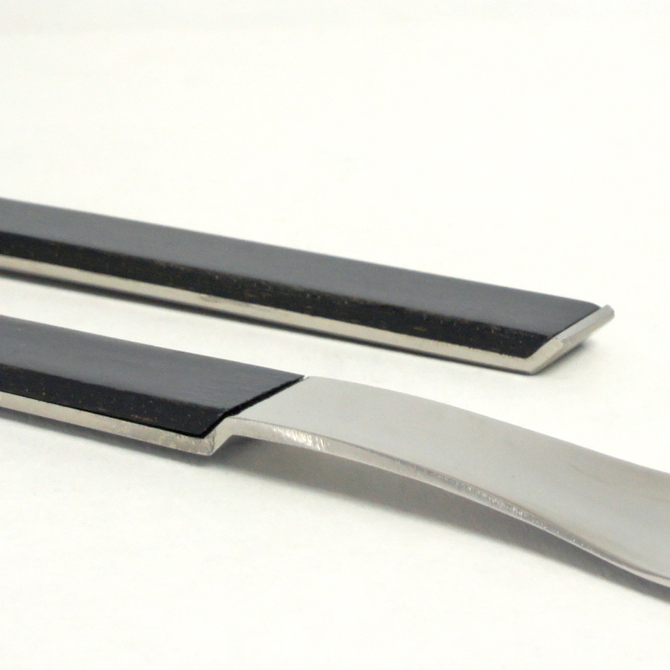 ステンレスのグリップ部に薄いエボニー/黒檀材を嵌めたフラットなハンドル。異素材のコントラストをシンプルなフォルムでまとめることで快適な使用感と美しさを両立させた優れた意匠。