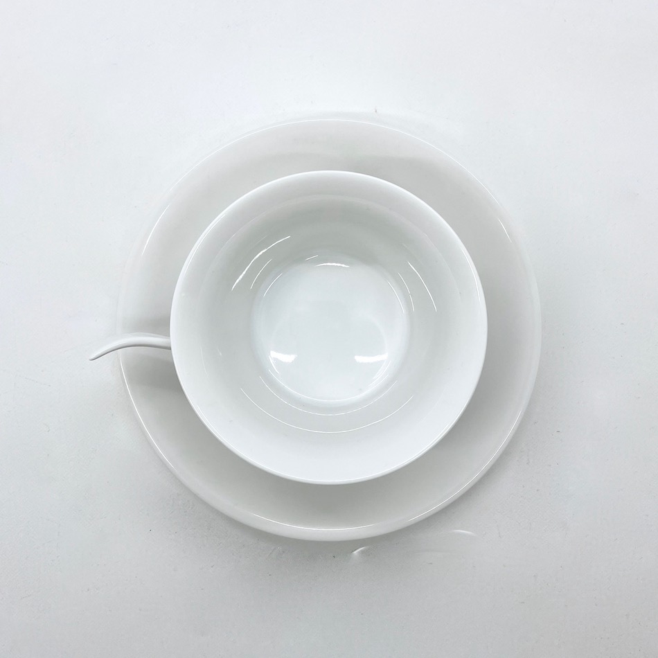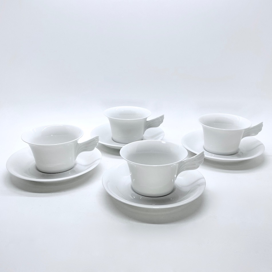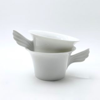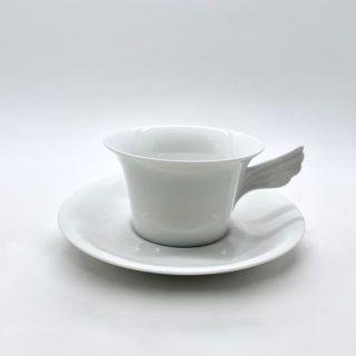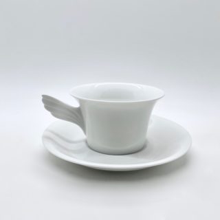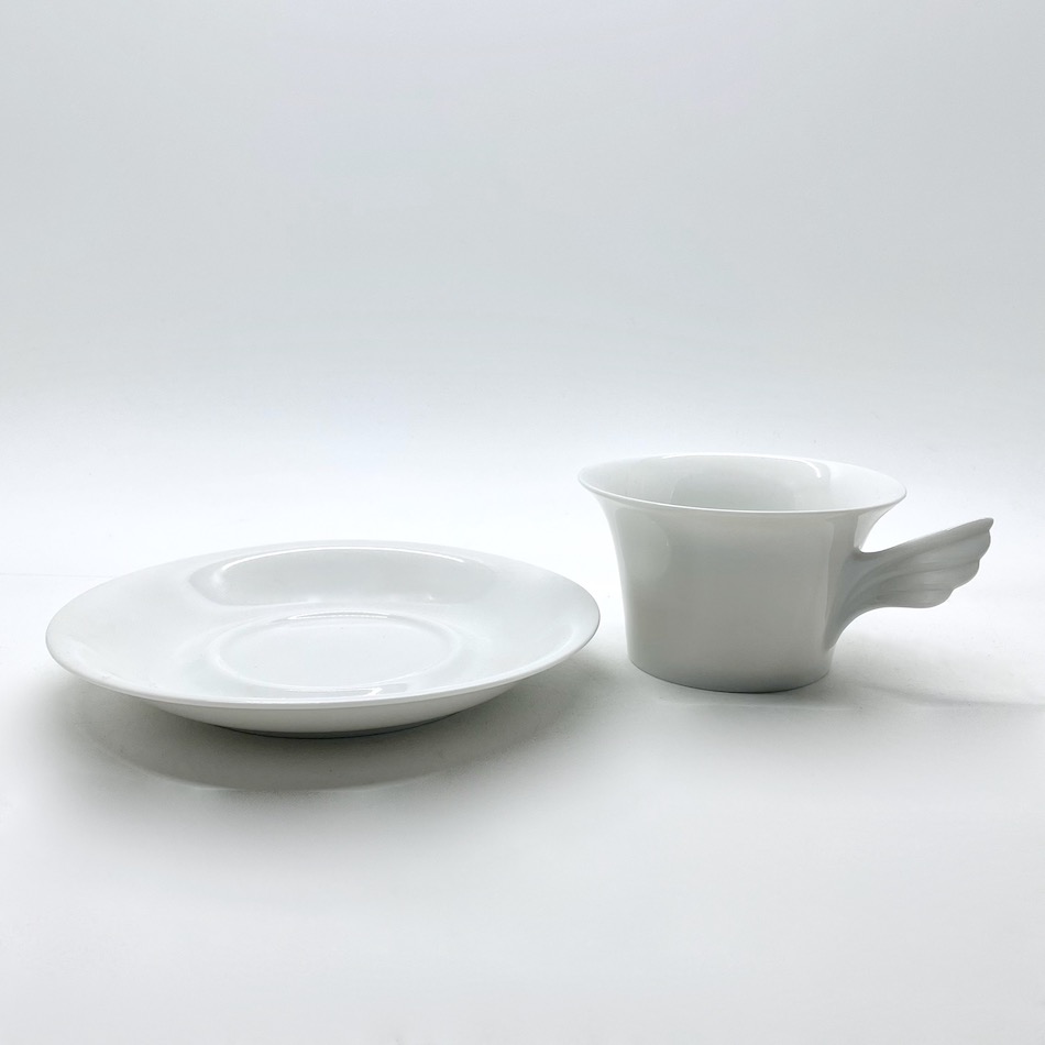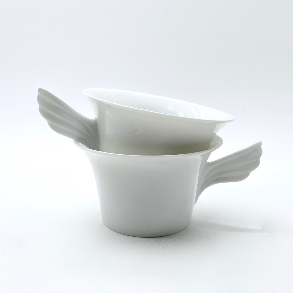 神話に登場する天使やペガサスの羽を想像させる繊細なカップハンドル。磁肌の白さと相まって、可憐さの中に神々の物語を秘めたような神聖なイメージのアートな器です。