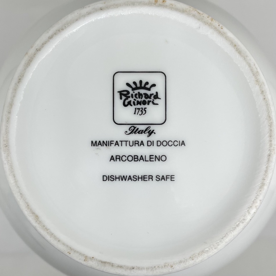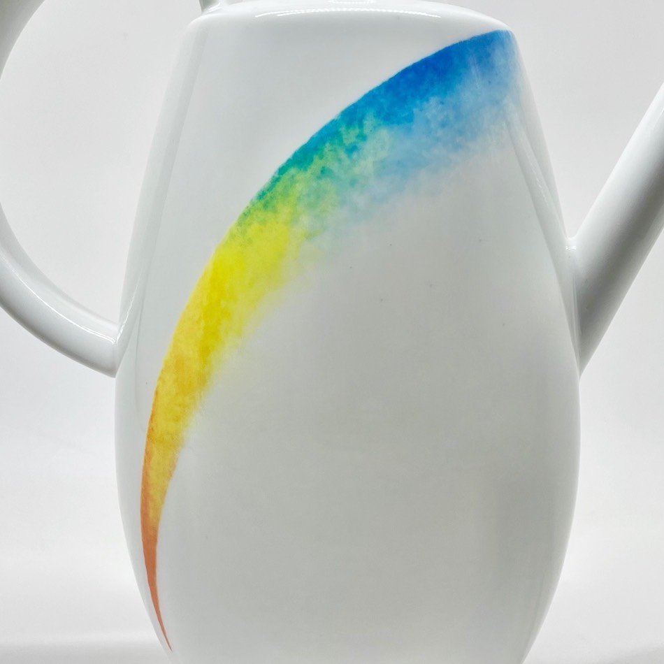 「NUVOLA = 雲」と名付けられたこのシリーズは、曲線と直線を巧みに組み合わせシンプルながら印象的な造形にまとめ上げるアスティらしいデザインの食器シリーズで、入荷品はレインボーのグラデーションがボディを斜めに走る「ARCOBALENO = 虹」という図柄のモデル。