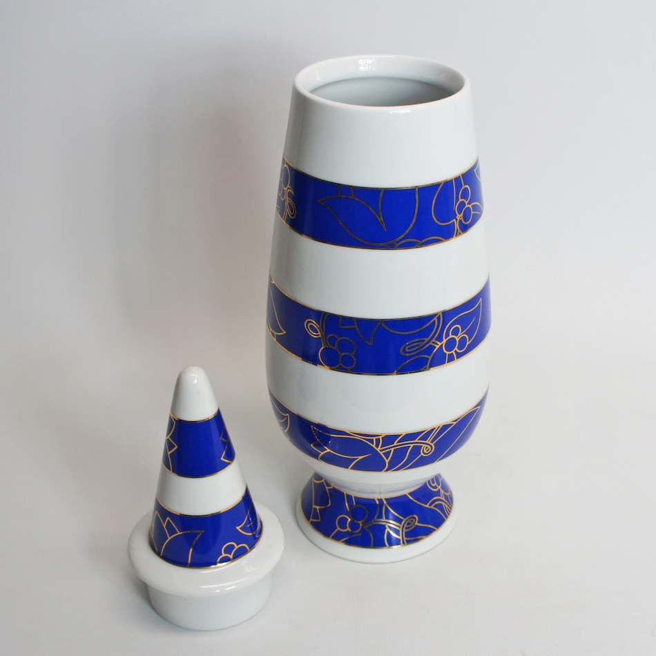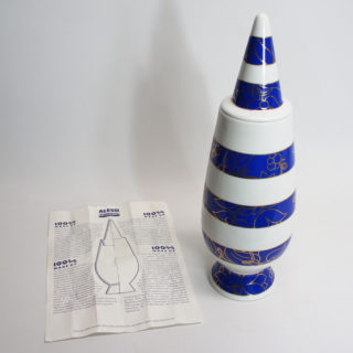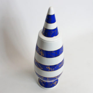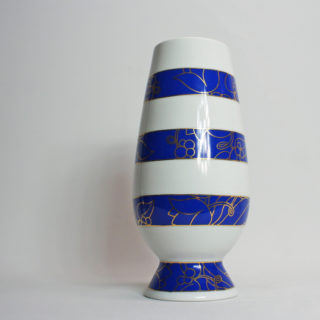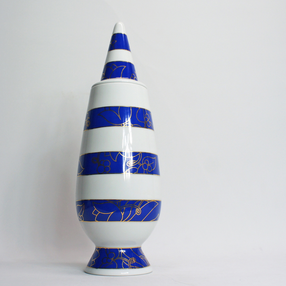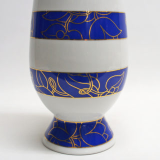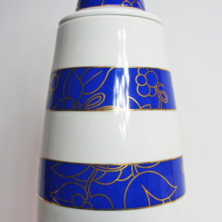 ホワイト&ブルーのボーダーはブルーの部分にだけ金彩で花柄が描かれた意外とシンプルな図案。メンディーニの挑発的なフォルムを与えられたクレイヴスが、あえて相反する品格や理性的な印象に変換しようと試みた計算があるのでは?と想像させます。