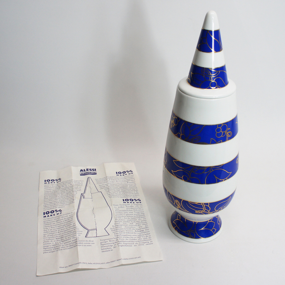1992年より始まった、ALESSIの”Tendentse”ブランド”100% Make Up”シリーズ。”Alessandro Mendini / アレッサンドロ・メンディーニ”がフォルムデザインした花瓶に、世界各国の様々なクリエーター100人が絵付けデザインを施し、各限定100ピースのみ製造した異色のシリーズ。