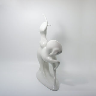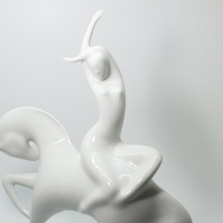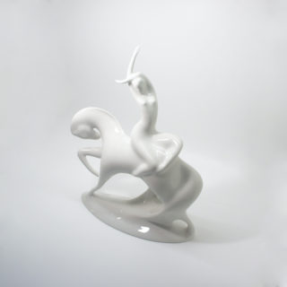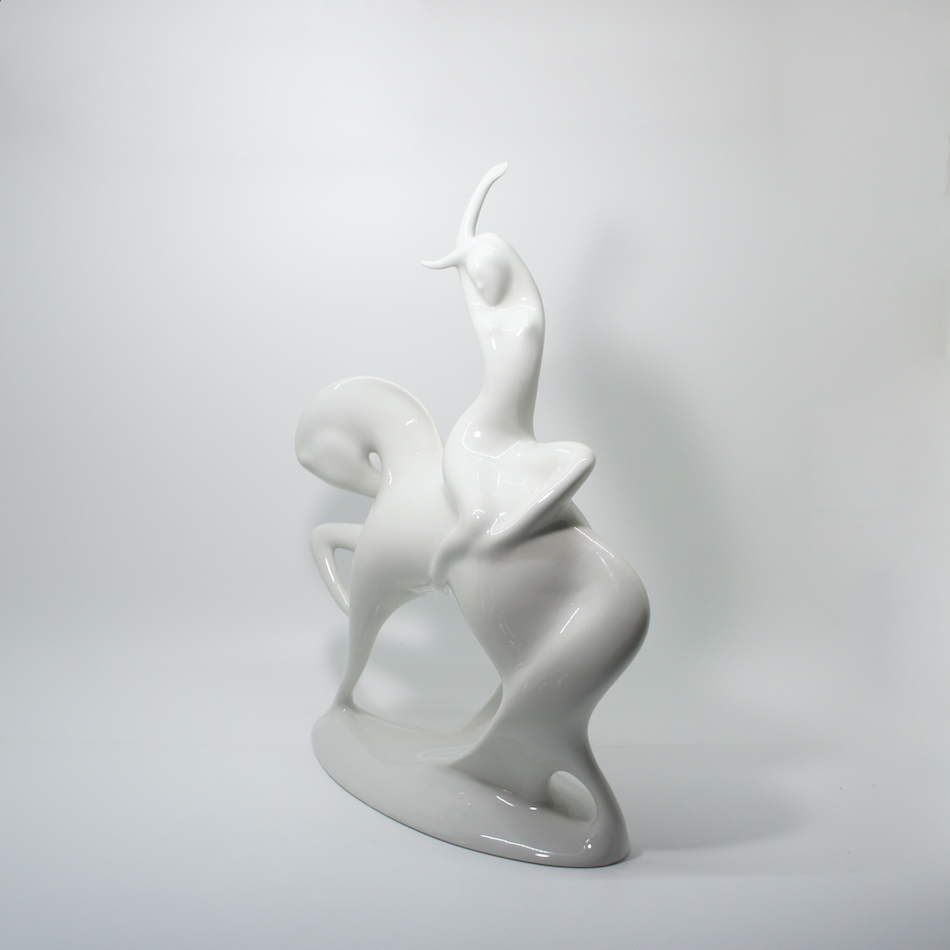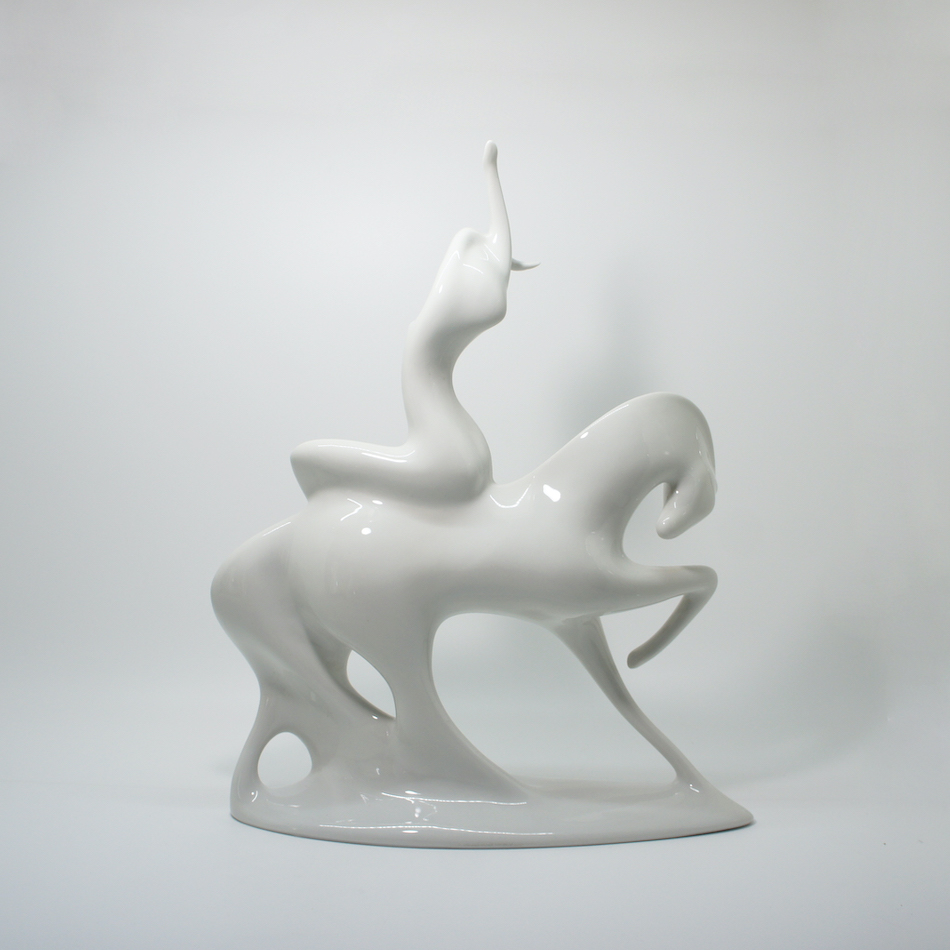 ゴディバチョコレートのシンボルマークでも知られる、「裸で馬にまたがって行進し領民を救う11世紀英国の誇り高き伯爵夫人の伝説の女性=レディ・ゴディバ」をモチーフにミニマルかつエレガントに表現した作品。白一色の磁器表面の陰影やハイライトが美しいコントラストを生み、造形美をよりいっそう際立たせます。