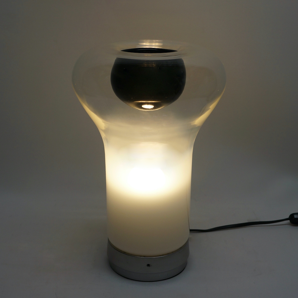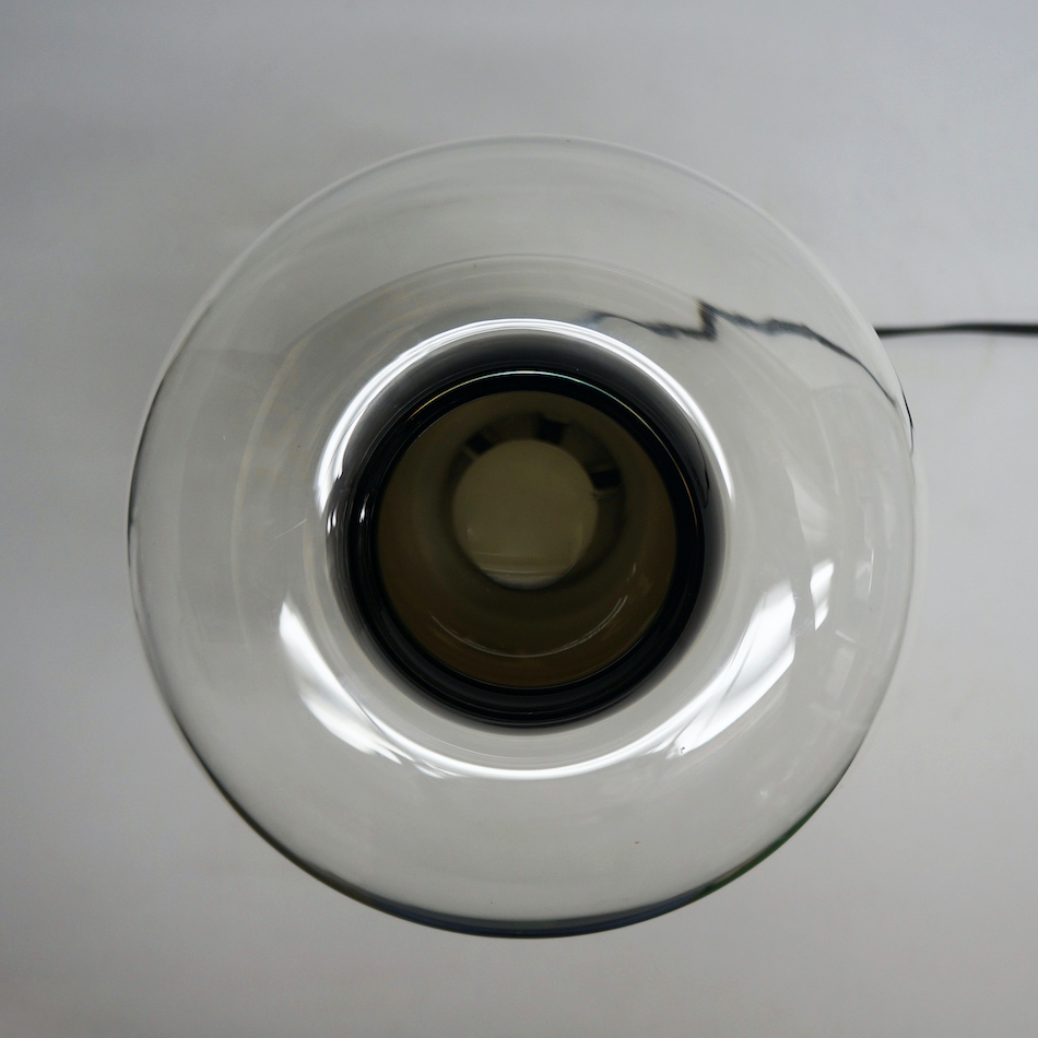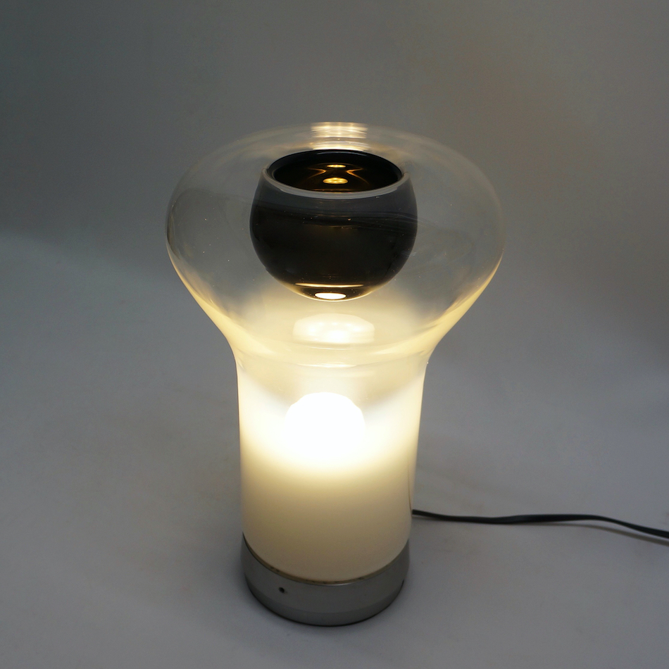 ムラノガラス”VISTOSI”で製造したハンドブロー成形のオーガニックなキノコフォルム、乳白色のグラデーションから中央に沈んだ黒色ガラスが浮遊しているように見える意匠。