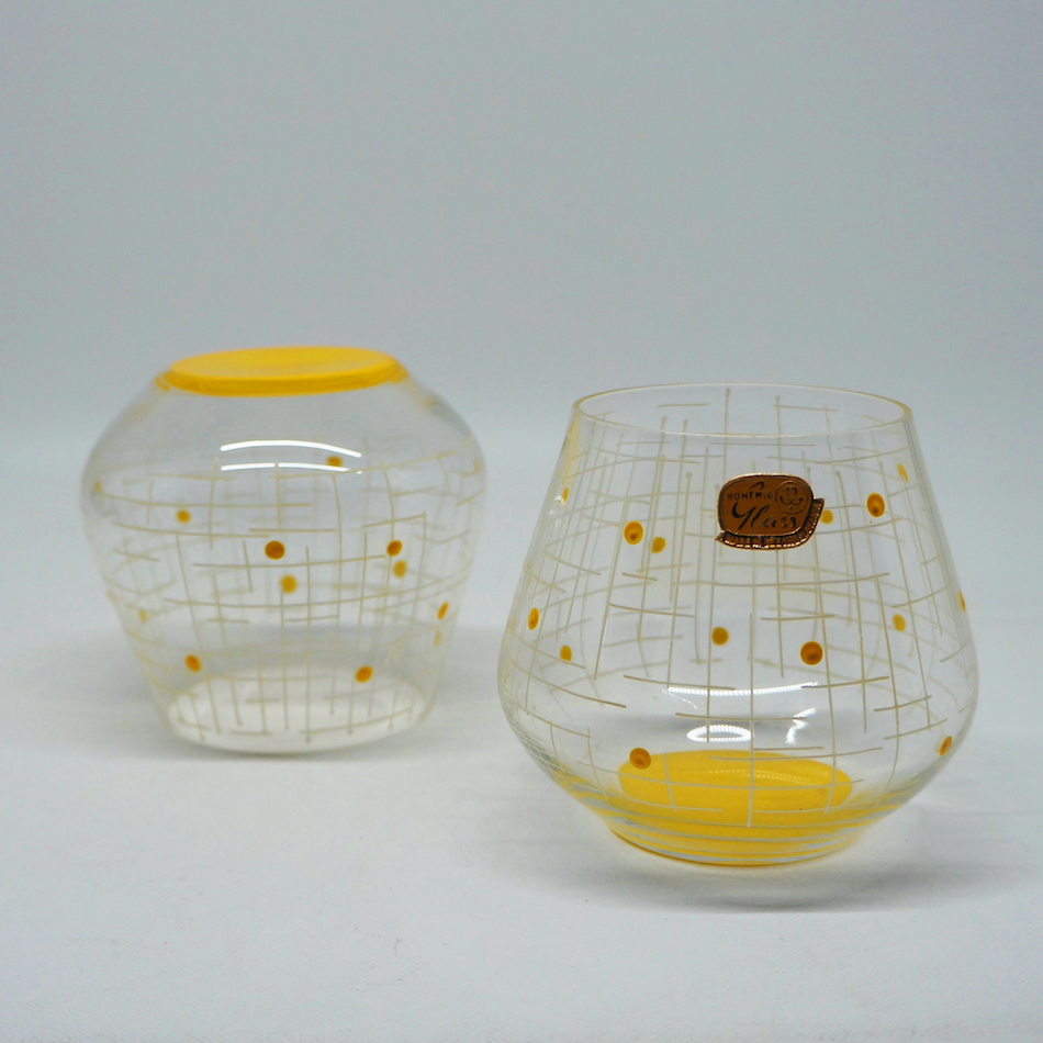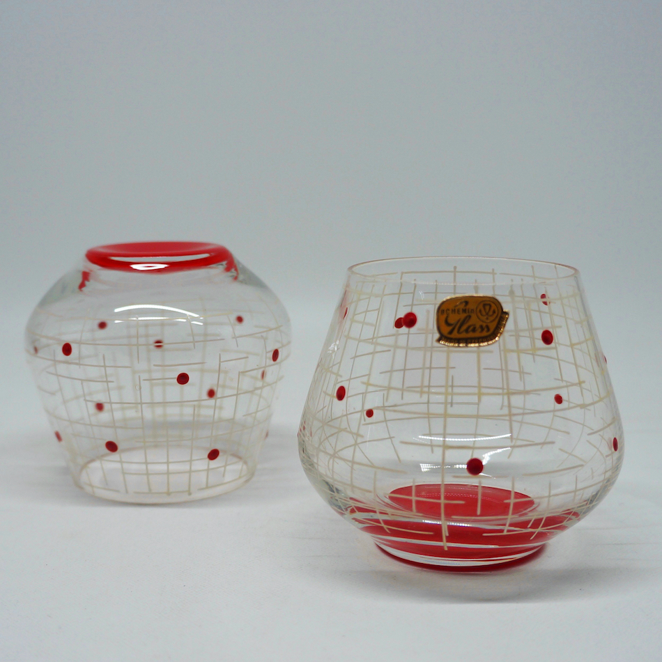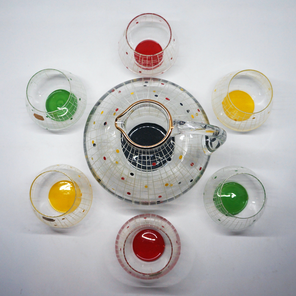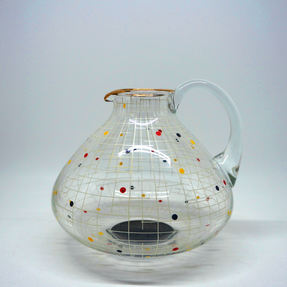 薄く膨よかなフォルムのマウスブローグラスとピッチャーには、それぞれ白い格子模様と赤、黄、緑のドットがハンドペイントで描かれた極めてPOPなミッドセンチュリーデザイン。
