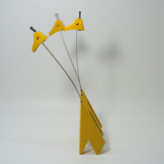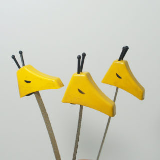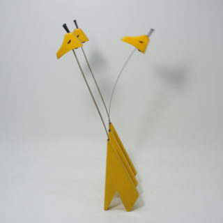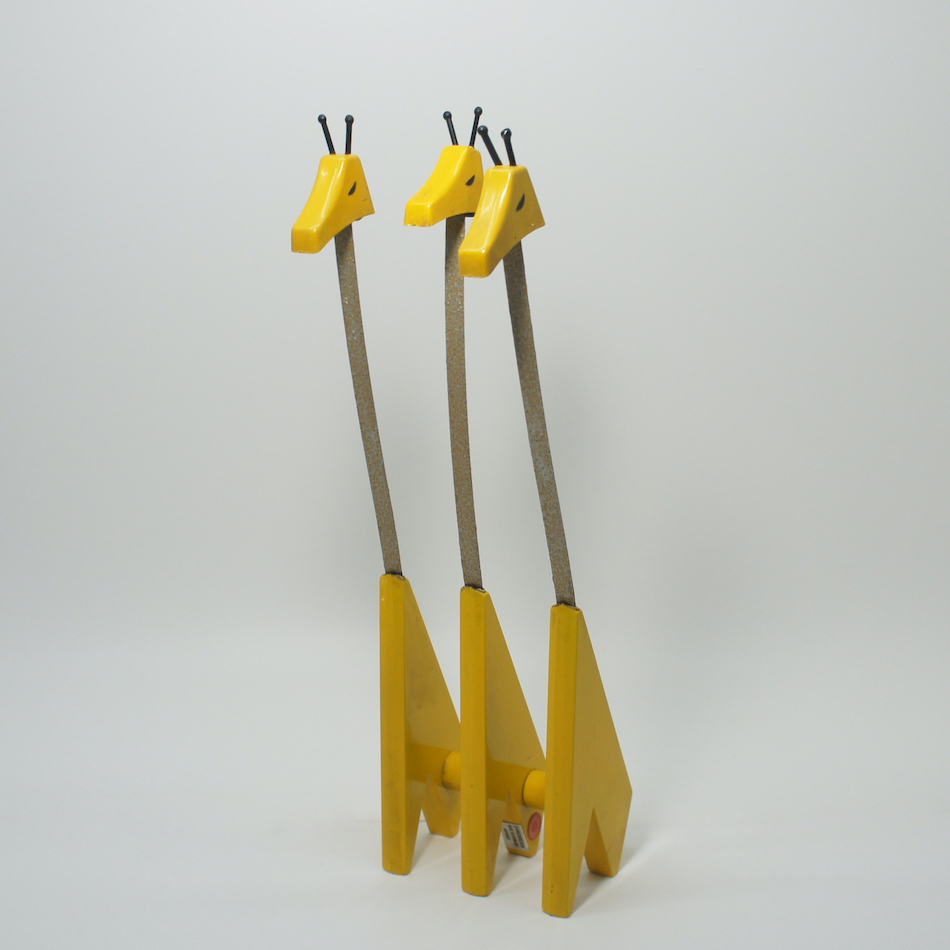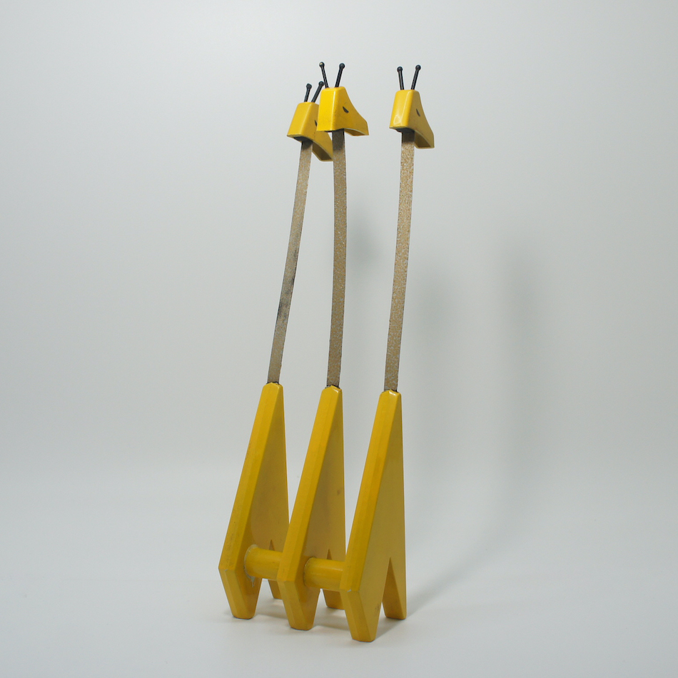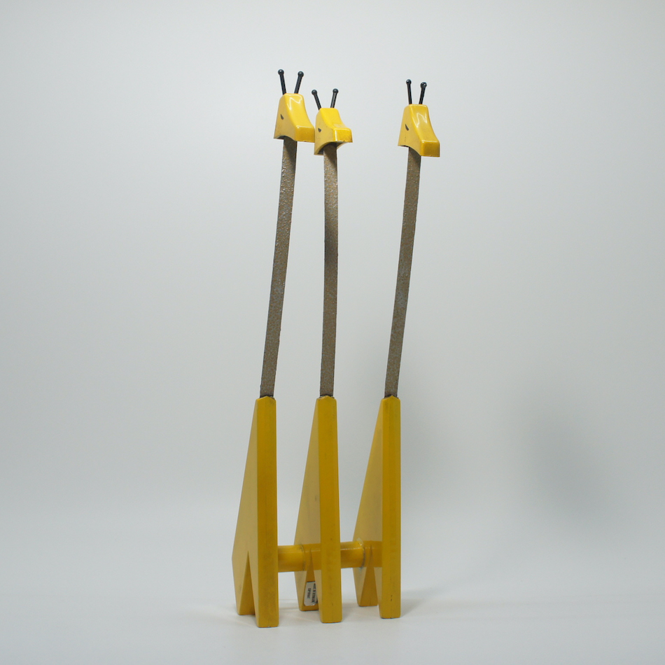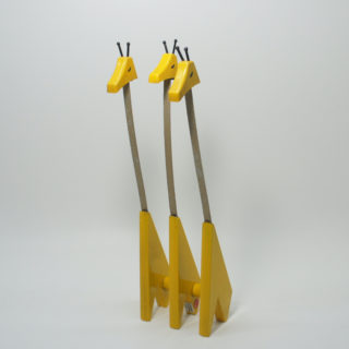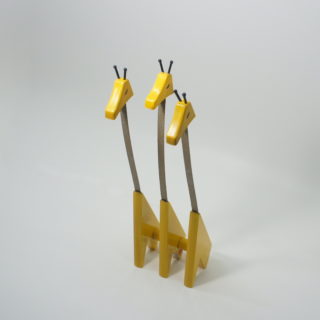 キリンの首に軽く触れると、3頭の長い首がまるでメトロノームのように前後にスウィング。それぞれの頭部に磁石が仕込まれており、1頭を動かすと反発しあって隣のキリンも揺れ出す仕組み。 軽く触れるだけでユーモラスに暫くスイングを続けます。