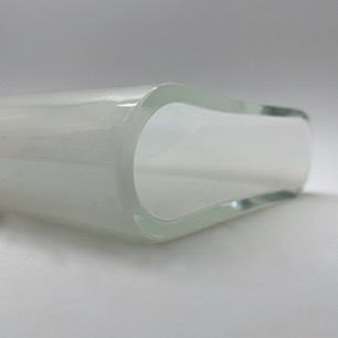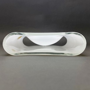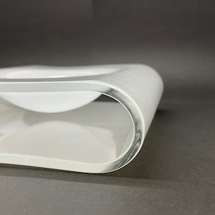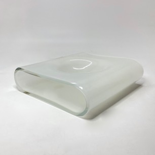 厚さ5mmのガラスプレートをひしゃげたチューブ状につなぎ、その片面中央に窪みを持たせることで個性的なデザインを実現したトレー。