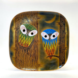縦横30cm近い大きく厚いカッパープレートに、「月夜の森で大きく目を見開く2羽のフクロウ」を独特の彩色と巧妙なタッチのエナメル技法で大胆に描いたアーティスティックなアイテム。