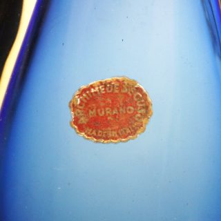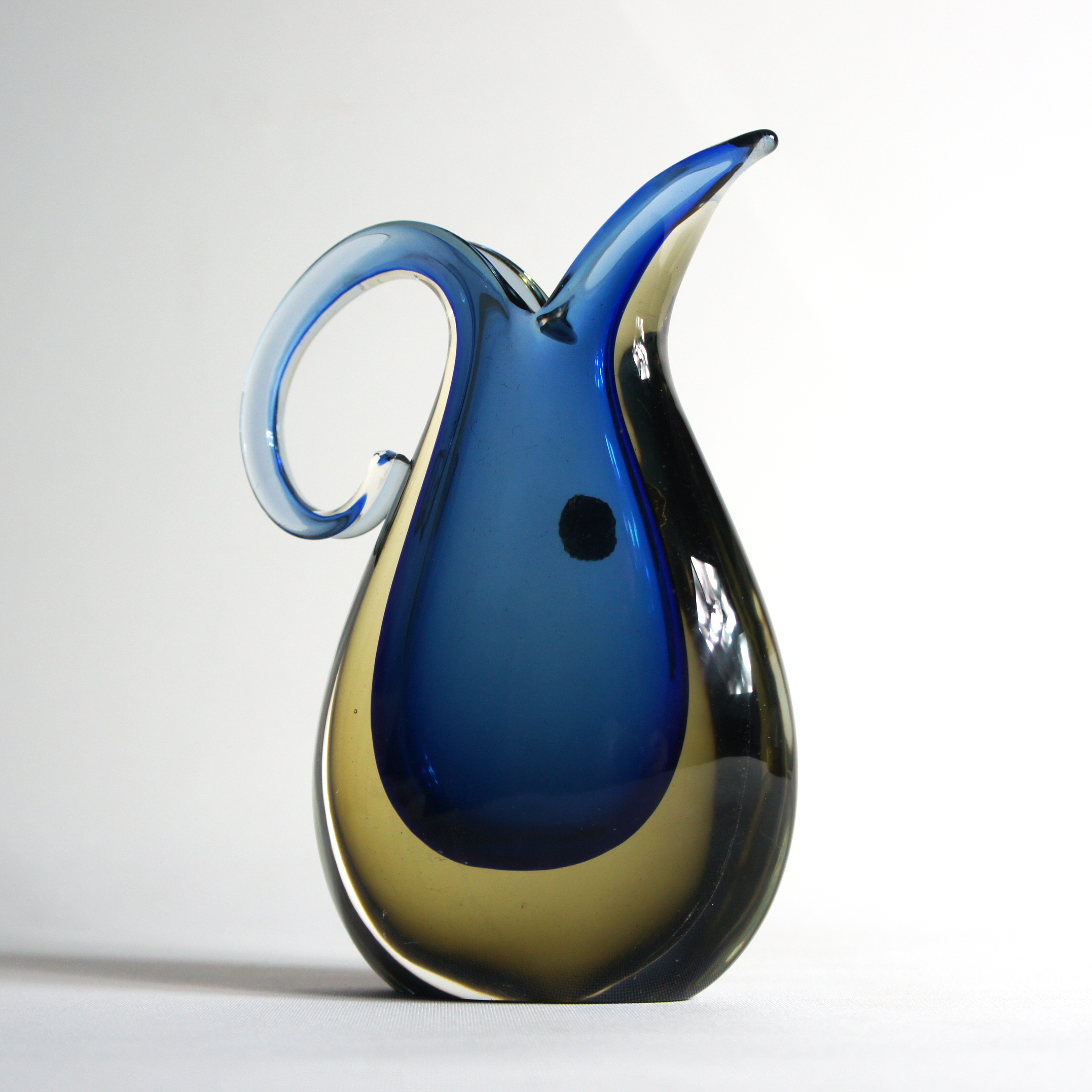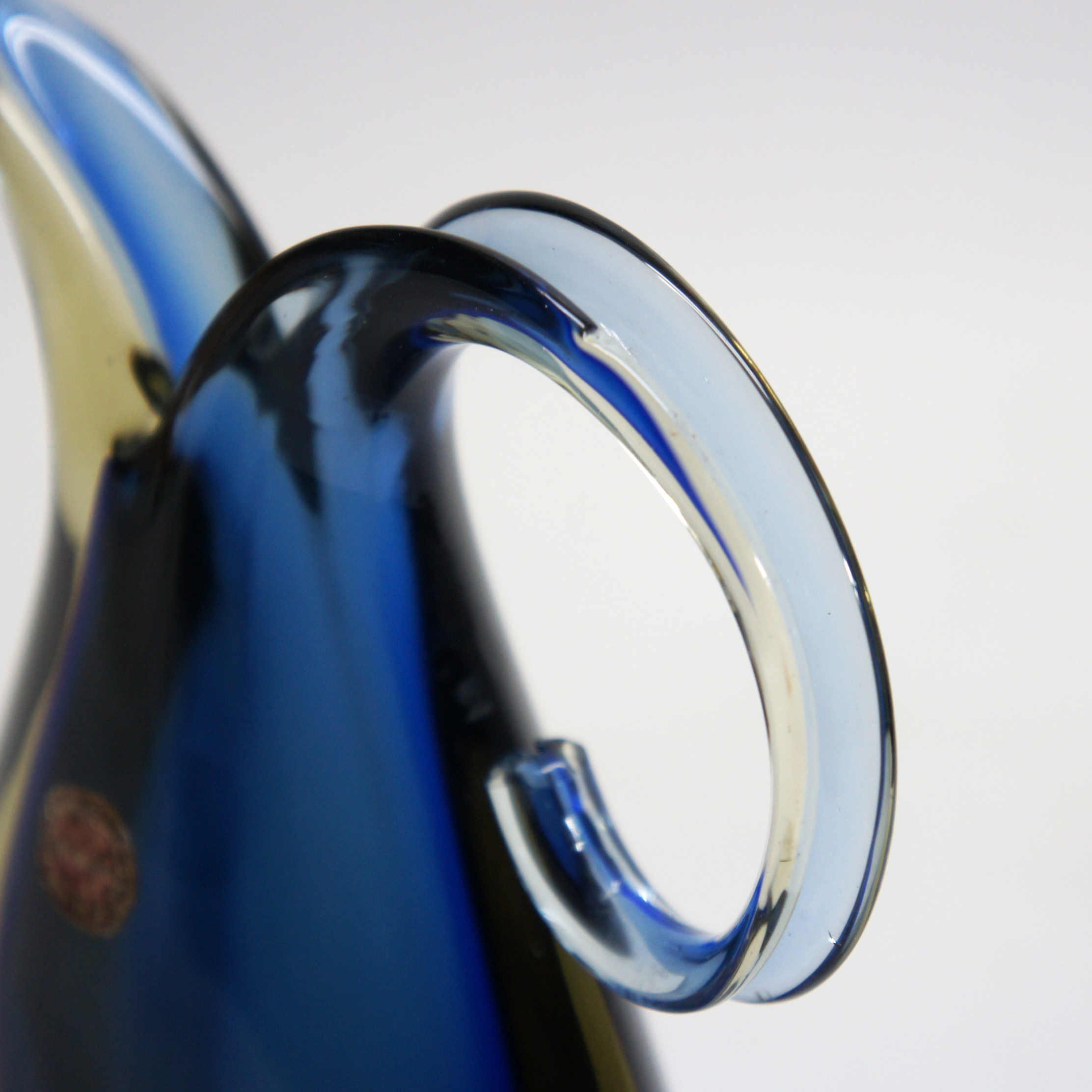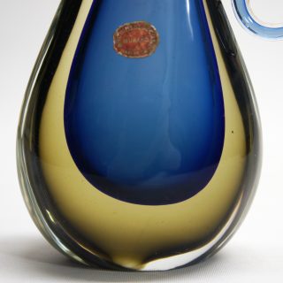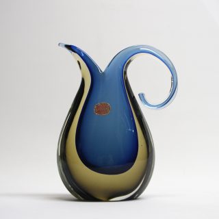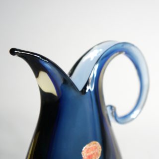 ムラノガラス伝統の”Sommerso / ソメルソ技法”の景色は、水中に落ちた水滴のごとく青い美しいガラスの層が成形されています。口元~ハンドルにかけての造形もとても優美。ヴィンテージムラノの典型的な美しさを有しています。