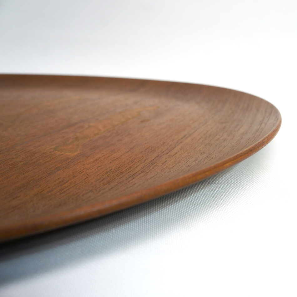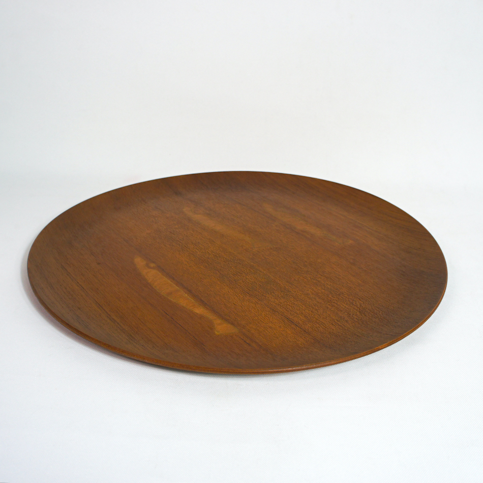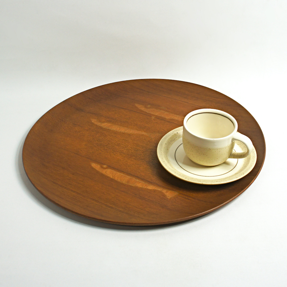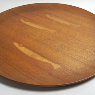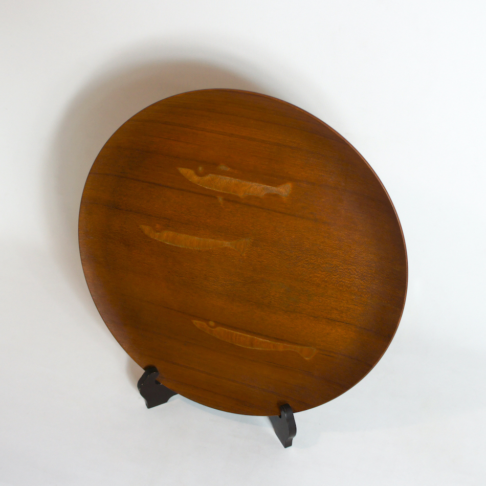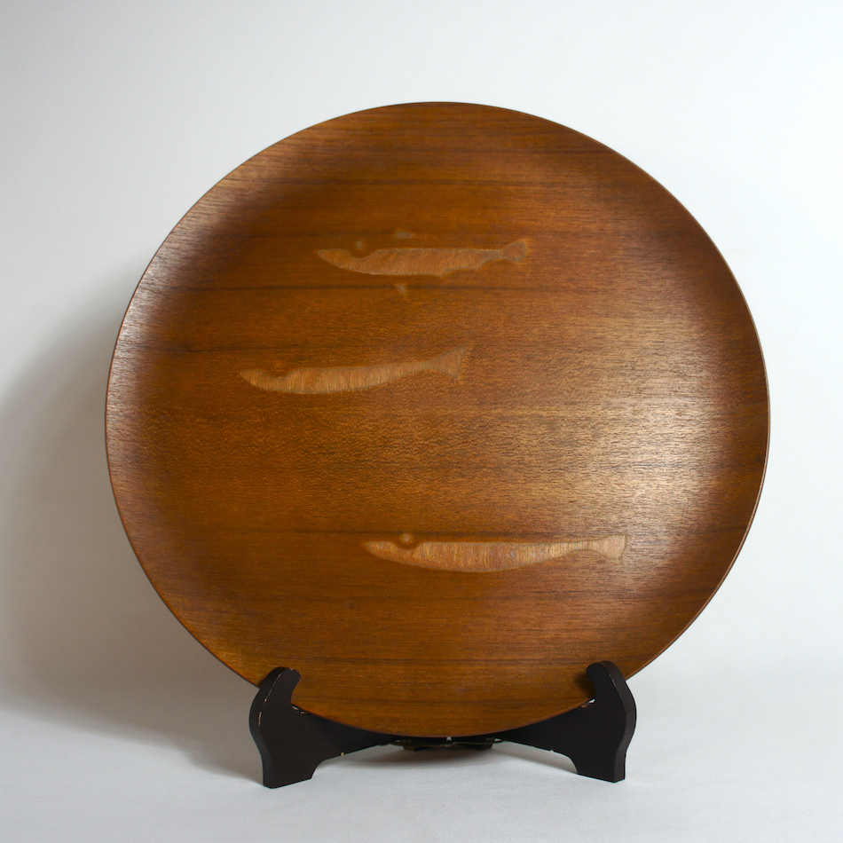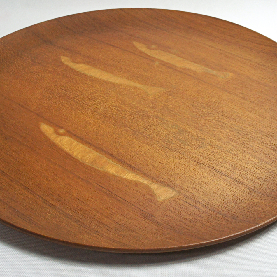 大きなチークプライウッド製の正円トレイ。チーク材プライウッドの表面をエッチングしたように細かく削って下地を出すことで、モダンな魚が泳ぐ様を表現した独特の工芸技法。トレーエッジの僅かに浮いた意匠にも、繊細な技術が見て取れます。